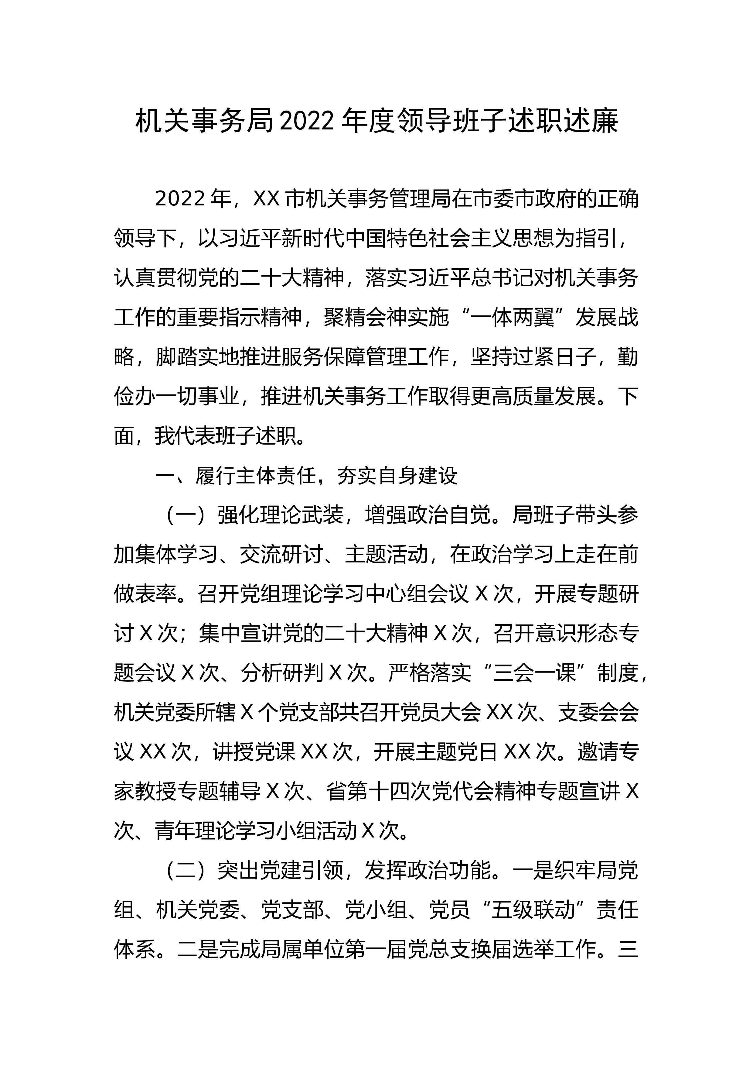 机关事务局2022年度领导班子述职述廉2022年,XX市机关事务管理局在市委市政府的正确领导下,以习近平新时代中国特色社会主义思想为指引,认真贯彻党的二十大精神,落实习近平总书记对机关事务工作的重要指示精神,聚精会神实施“一体两翼”发展战略,脚踏实地推进服务保障管理工作,坚持过紧日子,勤俭办一切事业,推进机关事务工作取得更高质量发展。下面,我代表班子述职。一、履行主体责任,夯实自身建设(一)强化理论武装,增强政治自觉。局班子带头参加集体学习、交流研讨、主题活动,在政治学习上走在前做表率。召开党组理论学习中心组会议X次,开展专题研讨X次;集中宣讲党的二十大精神X次,召开