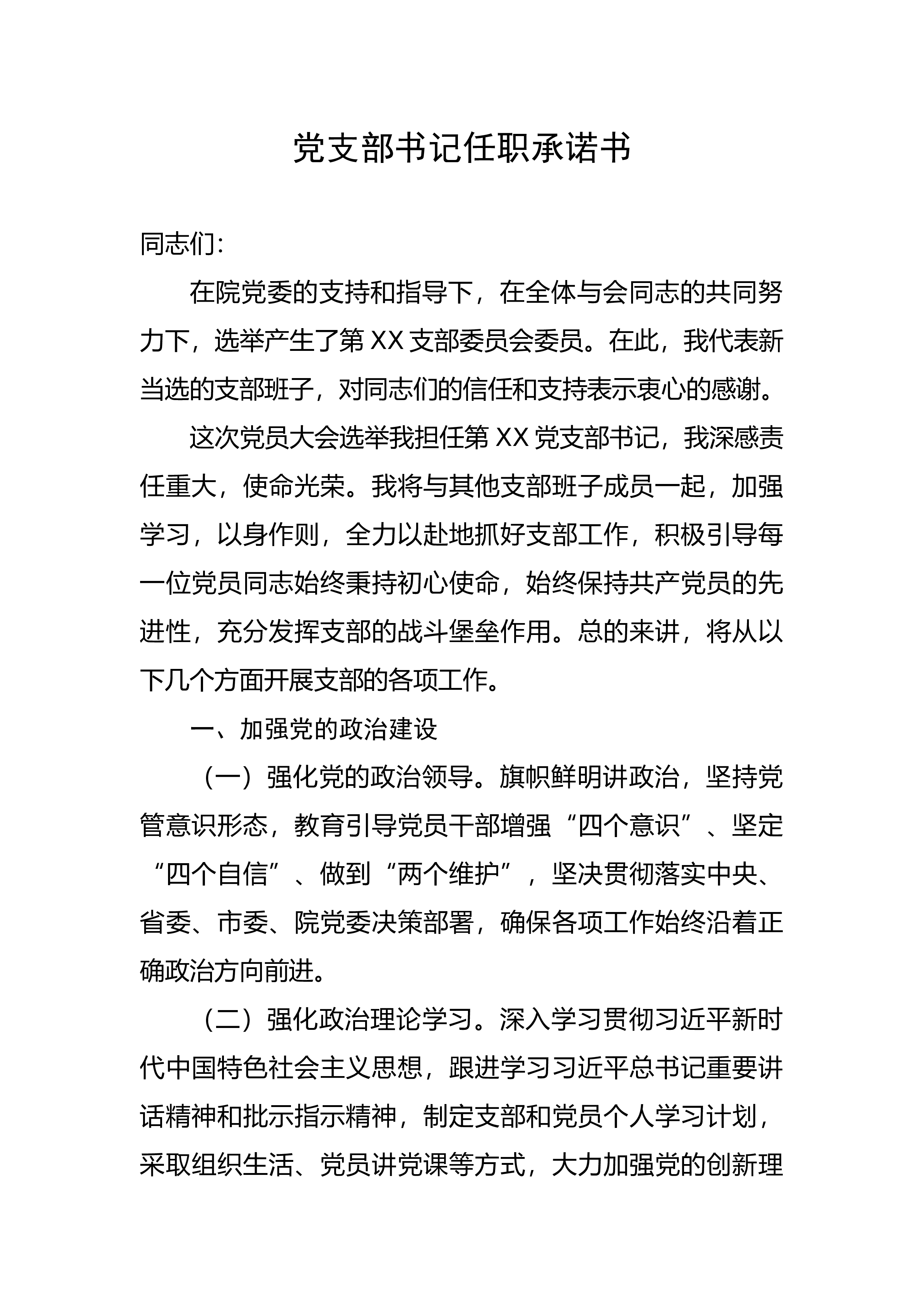 党支部书记任职承诺书同志们:在院党委的支持和指导下,在全体与会同志的共同努力下,选举产生了第XX支部委员会委员。在此,我代表新当选的支部班子,对同志们的信任和支持表示衷心的感谢。这次党员大会选举我担任第XX党支部书记,我深感责任重大,使命光荣。我将与其他支部班子成员一起,加强学习,以身作则,全力以赴地抓好支部工作,积极引导每一位党员同志始终秉持初心使命,始终保持共产党员的先进性,充分发挥支部的战斗堡垒作用。总的来讲,将从以下几个方面开展支部的各项工作。一、加强党的政治建设(一)强化党的政治领导。旗帜鲜明讲政治,坚持党管