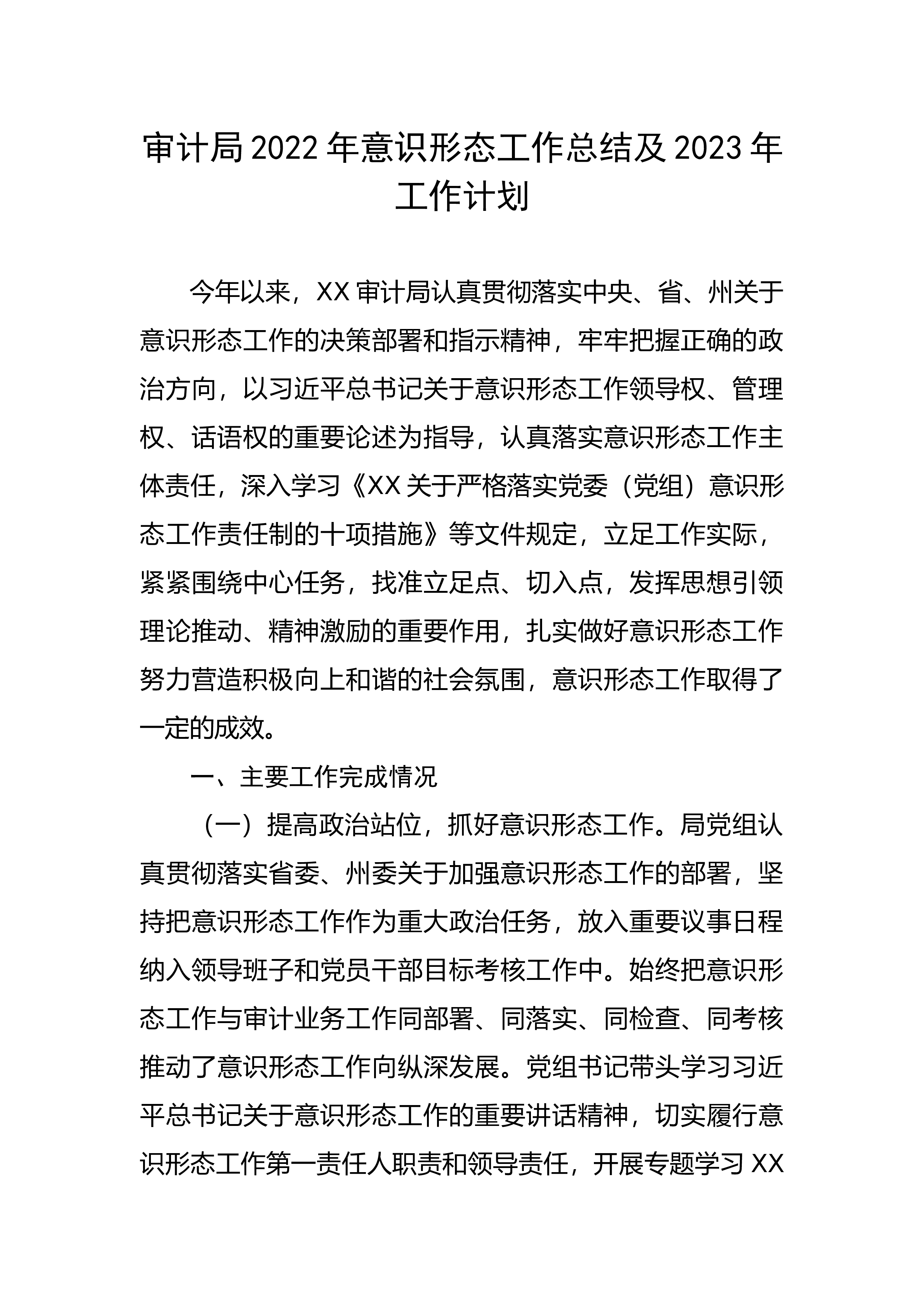 工作总结及2023年工作计划今年以来,XX审计局认真贯彻落实中央、省、州关于
