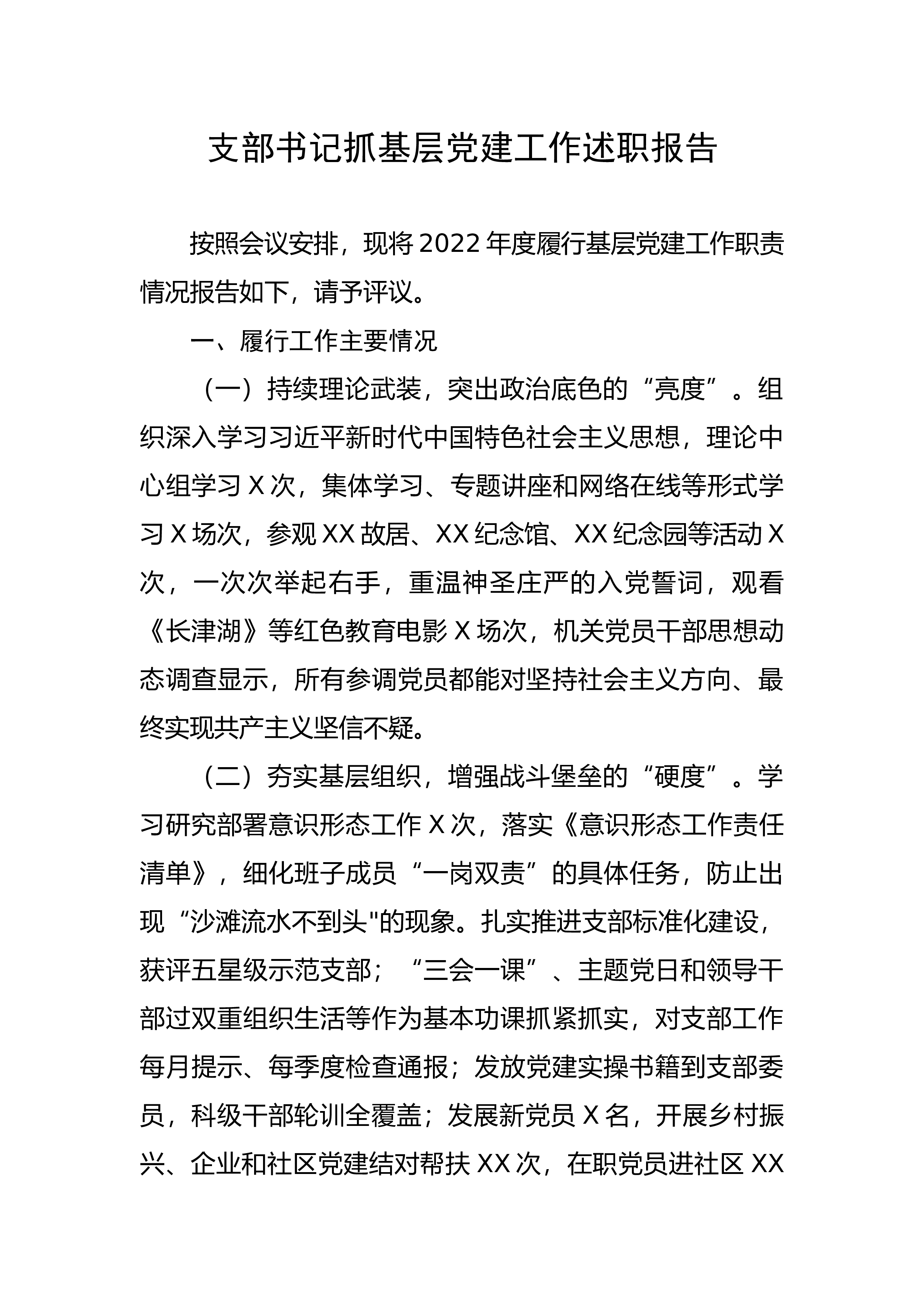 支部书记抓基层党建工作述职报告按照会议安排,现将2022年度履行基层党建工作职责情况报告如下,请予评议。一、履行工作主要情况(一)持续理论武装,突出政治底色的“亮度”。组织深入学习习近平新时代中国特色社会主义思想,理论中心组学习X次,集体学习、专题讲座和网络在线等形式学习X场次,参观XX故居、XX纪念馆、XX纪念园等活动X次,一次次举起右手,重温神圣庄严的入党誓词,观看《长津湖》等红色教育电影X场次,机关党员干部思想动态调查显示,所有参调党员都能对坚持社会主义方向、最终实现共产主义坚信不疑。(二)夯实基层组织,增强战斗堡垒的“硬度”。学习研究部署