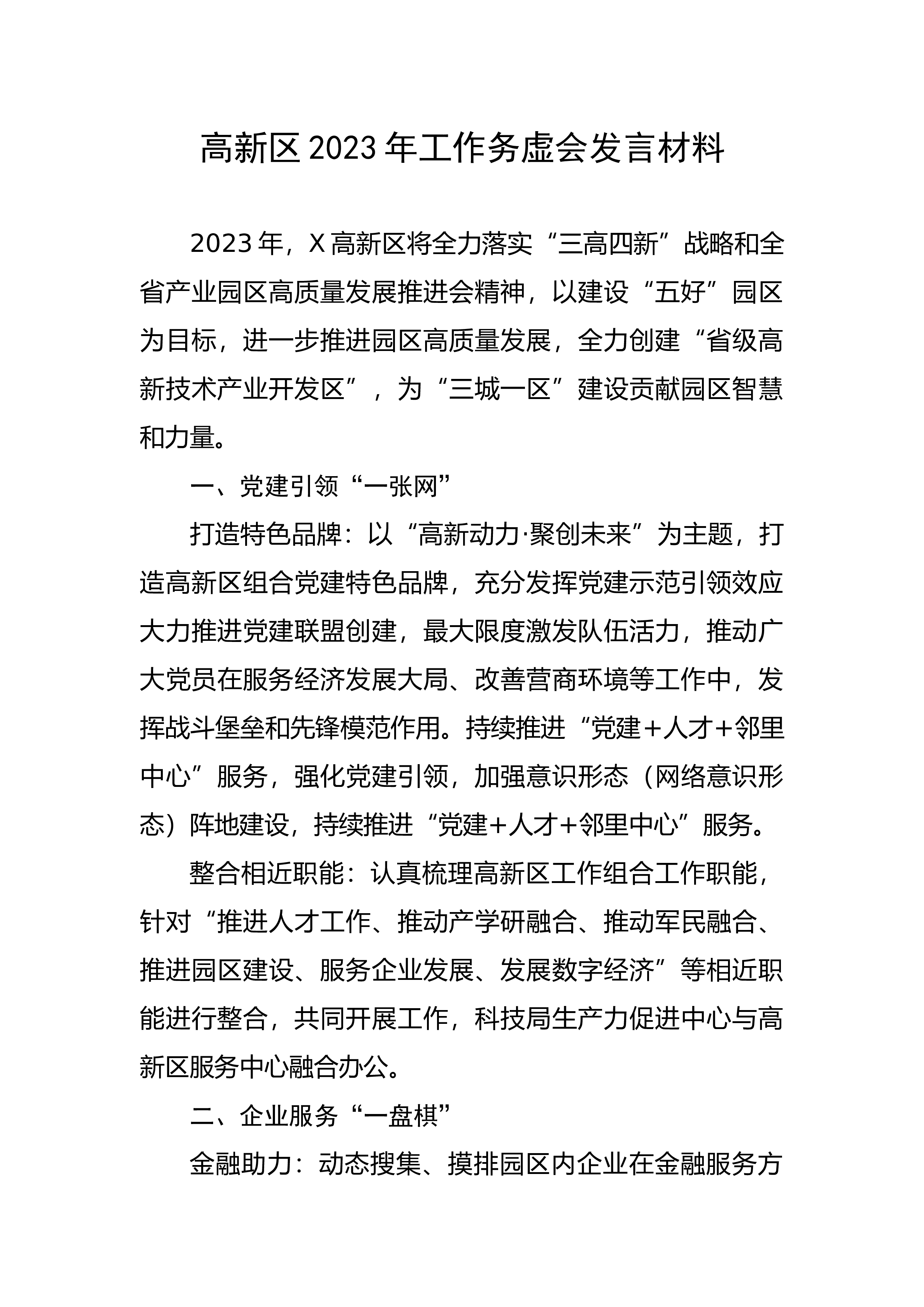 高新区2023年工作务虚会发言材料2023年,X高新区将全力落实“三高四新”战略和全省产业园区高质量发展推进会精神,以建设“五好”园区为目标,进一步推进园区高质量发展,全力创建“省级高新技术产业开发区”,为“三城一区”建设贡献园区智慧和力量。一、党建引领“一张网”打造特色品牌:以“高新动力·聚创未来”为主题,打造高新区组合党建特色品牌,充分发挥党建示范引领效应大力推进党建联盟创建,最大限度激发队伍活力,推动广大党员在服务经济发展大局、改善营商环境等工作中,发挥战斗堡垒和先锋模范作用。持续推进“党建+人才+邻里中心”服务,强化党建引领,加强