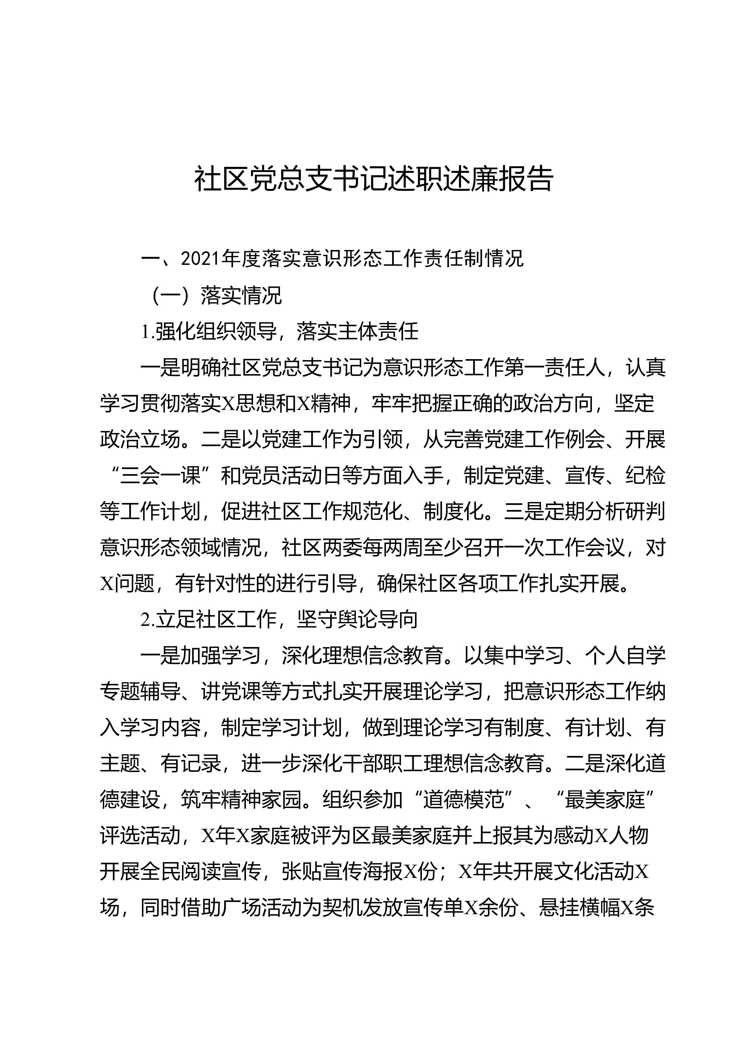 领域情况,社区两委每两周至少召开一次工作会议,对X问题,有针对性的进行引导,确保社区各项工作扎实开展。2.立足社区工作,坚守舆论导向一是加强学习,深化理想信念教育。以集中学习、个人自学专题辅导、讲党课等方...