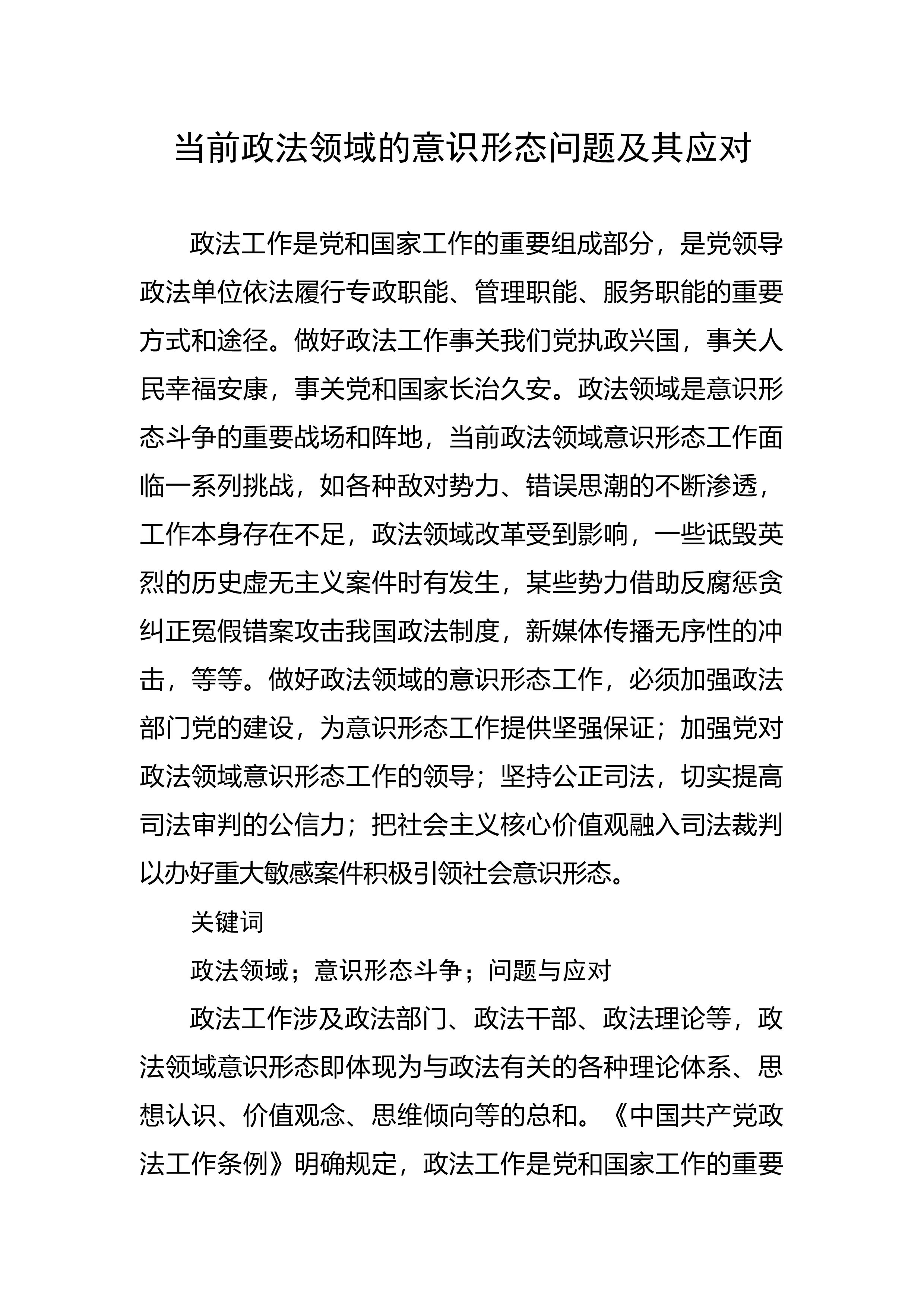 问题及其应对政法工作是党和国家工作的重要组成部分,是党领导政法单位依法履行专政职能、管理职能、服务职能的重要方式和途径。做好政法工作事关我们党执政兴国,事关人民幸福安康,事关党和国家长治久安。政法领域是