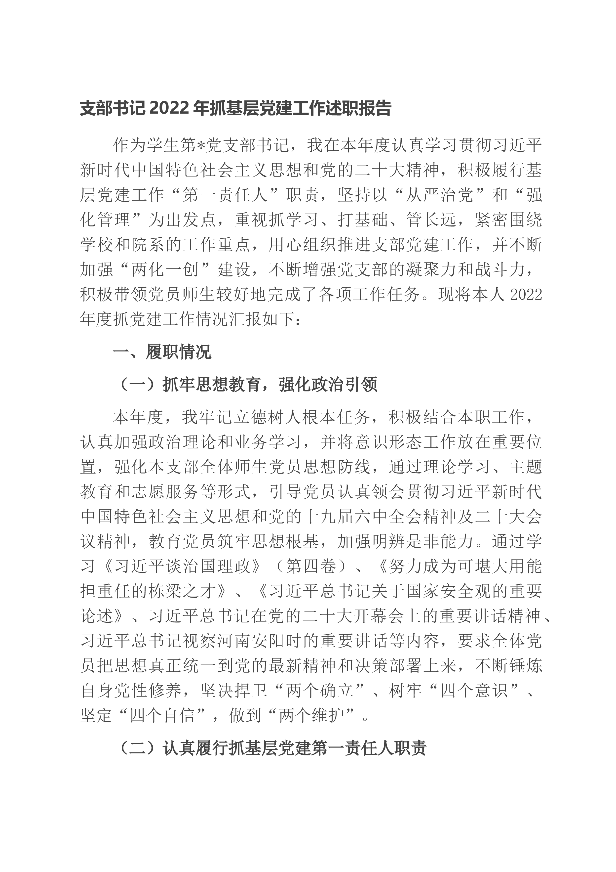 支部书记2022年抓基层党建工作述职报告作为学生第*党支部书记,我在本年度认真学习贯彻习近平新时代中国特色社会主义思想和党的二十大精神,积极履行基层党建工作“第一责任人”职责,坚持以“从严治党”和“强化管理”为出发点,重视抓学习、打基础、管长远,紧密围绕学校和院系的工作重点,用心组织推进支部党建工作,并不断加强“两化一创”建设,不断增强党支部的凝聚力和战斗力,积极带领党员师生较好地完成了各项工作任务。现将本人2022年度抓党建工作情况汇报如下:一、履职情况(一)抓牢思想教育,强化政治引领本年度,我牢记立德树人根本任务,积极结合本职工作,认真加强政治理论和业务学习,并将