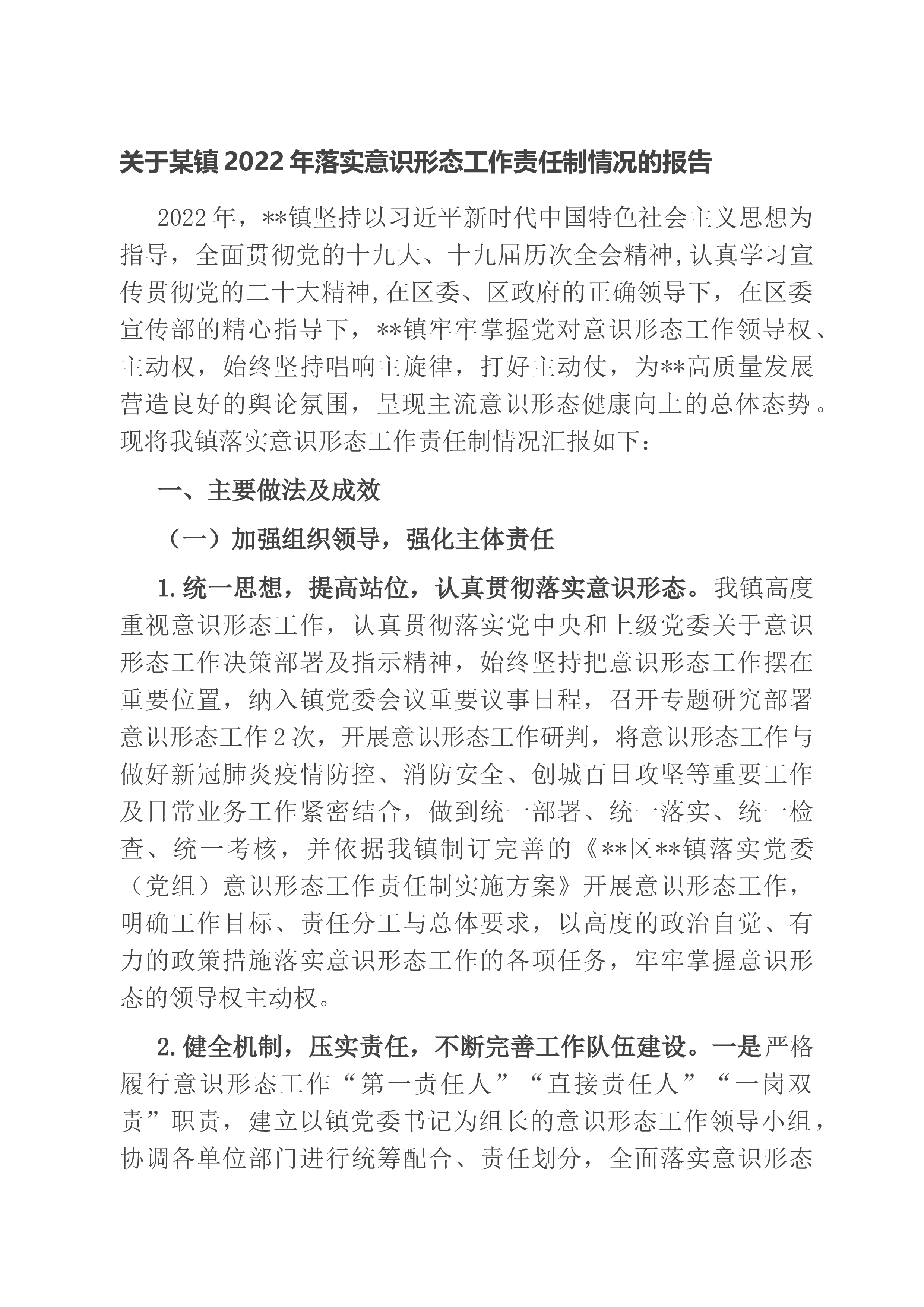 工作责任制情况的报告2022年,**镇坚持以习近平新时代中国特色社会主义思想为指导,全面贯彻党的十九大、十九届历次全会精神,认真学习宣传贯彻党的二十大精神,在区委、区政府的正确领导下,在区委宣传部的精心指导下,**镇牢牢掌握党对