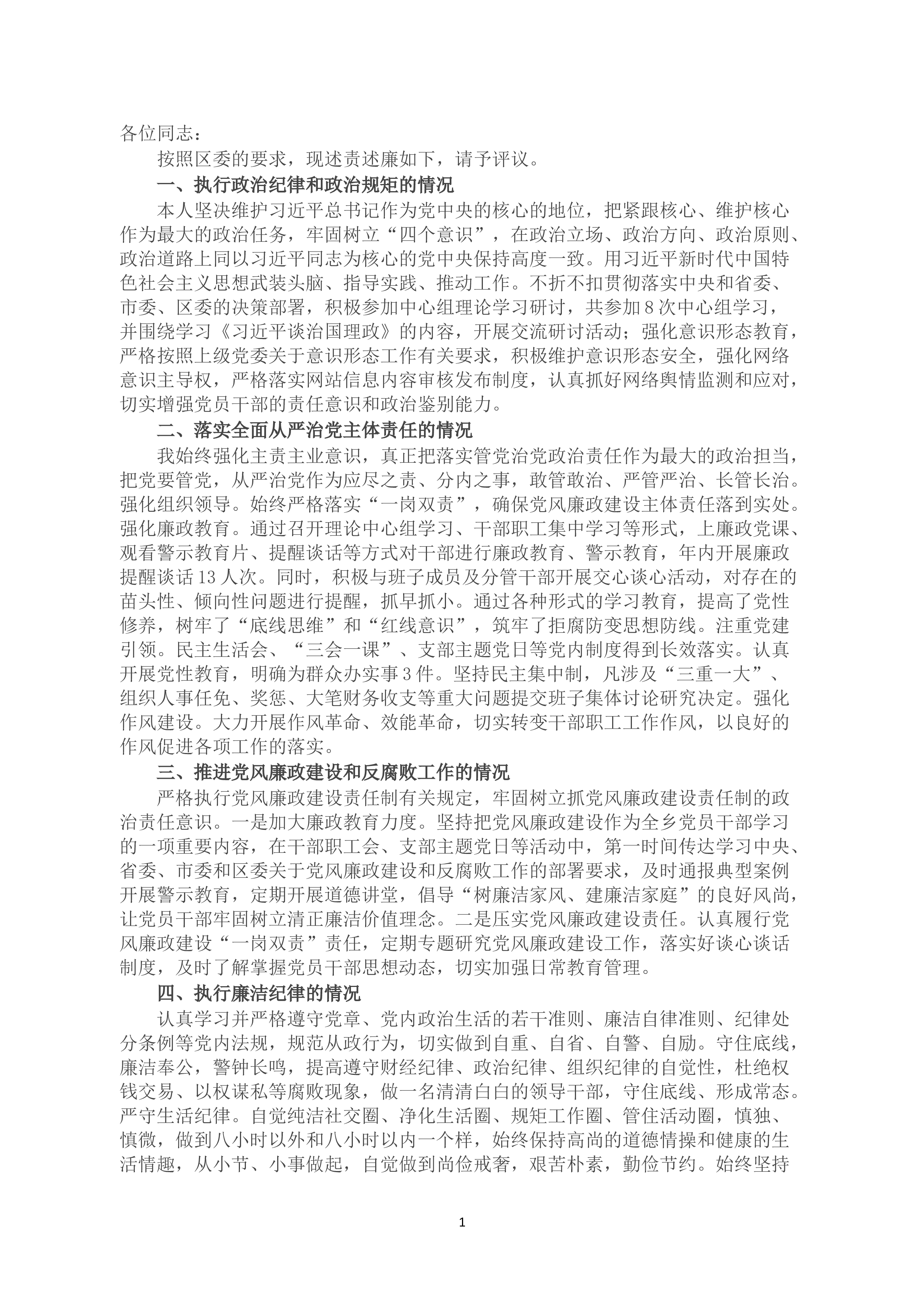 各位同志:按照区委的要求,现述责述廉如下,请予评议。一、执行政治纪律和政治规矩的情况本人坚决维护习近平总书记作为党中央的核心的地位,把紧跟核心、维护核心作为最大的政治任务,牢固树立“四个意识”,在政治立场、政治方向、政治原则、政治道路上同以习近平同志为核心的党中央保持高度一致。用习近平新时代中国特色社会主义思想武装头脑、指导实践、推动工作。不折不扣贯彻落实中央和省委、市委、区委的决策部署,积极参加中心组理论学习研讨,共参加8次中心组学习,并围绕学习《习近平谈治国理政》的内容,开展交流研讨活动;强化