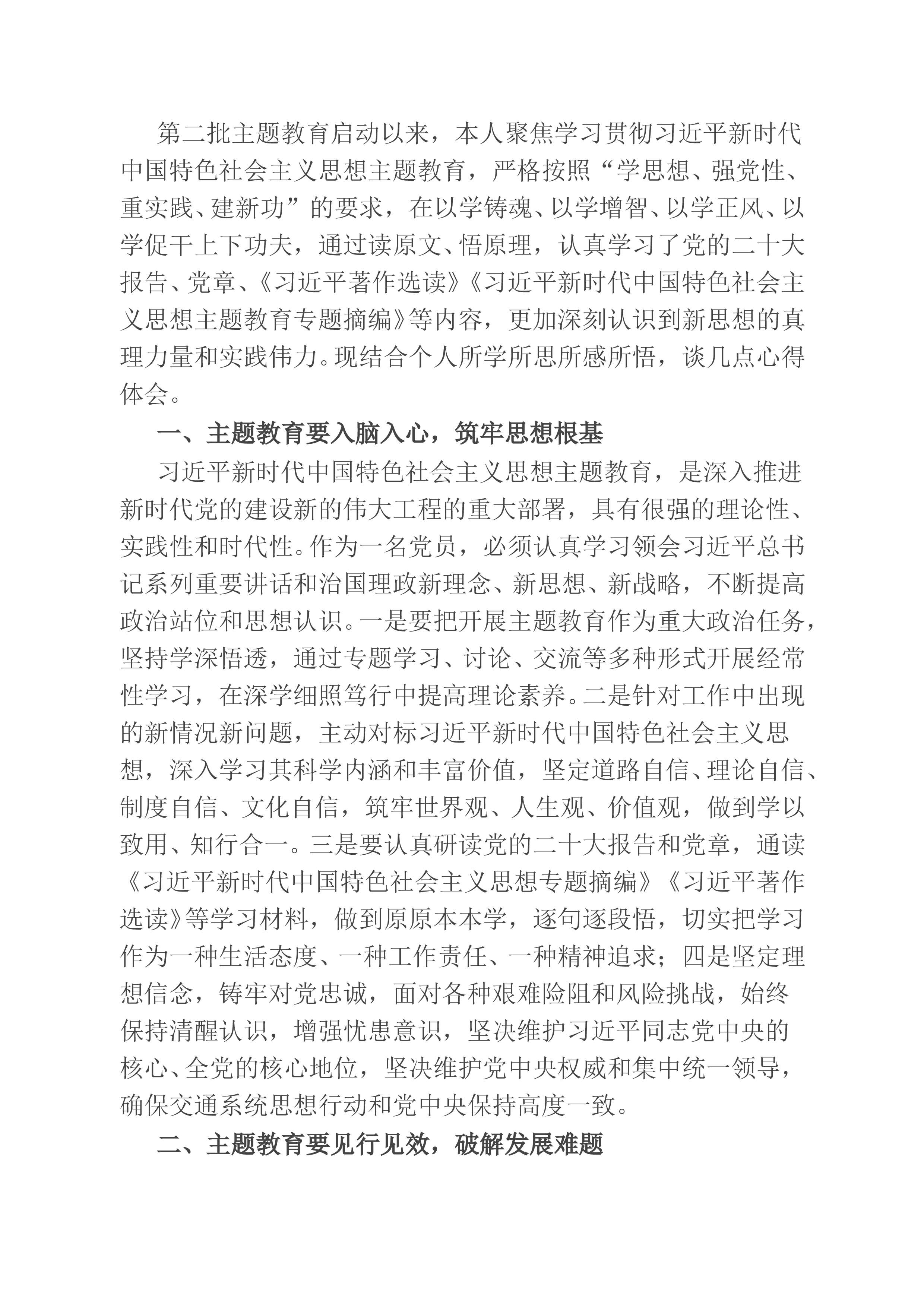 第二批主T教育启动以来,本人聚焦学习贯彻习近平新时代中国特色社会主义思想主T教育,严格按照“学思想、强党性、重实践、建新功”的要求,在以学铸魂、以学增智、以学正风、以学促干上下功夫,通过读原文、悟原理,认真学习了党的二十大报告、党章、《习近平著作选读》《习近平新时代中国特色社会主义思想主T教育专题摘编》等内容,更加深刻认识到新思想的真理力量和实践伟力。现结合个人所学所思所感所悟,谈几点心得体会。一、主T教育要入脑入心,筑牢思想根基习近平新时代中国特色社会主义思想主T教育,是深入推进新时代党的建设新的伟大工程的重大部署,具有很强的理论性、实践性和时代性。作为一名党员,必须认真学习领会习近平总书记...
