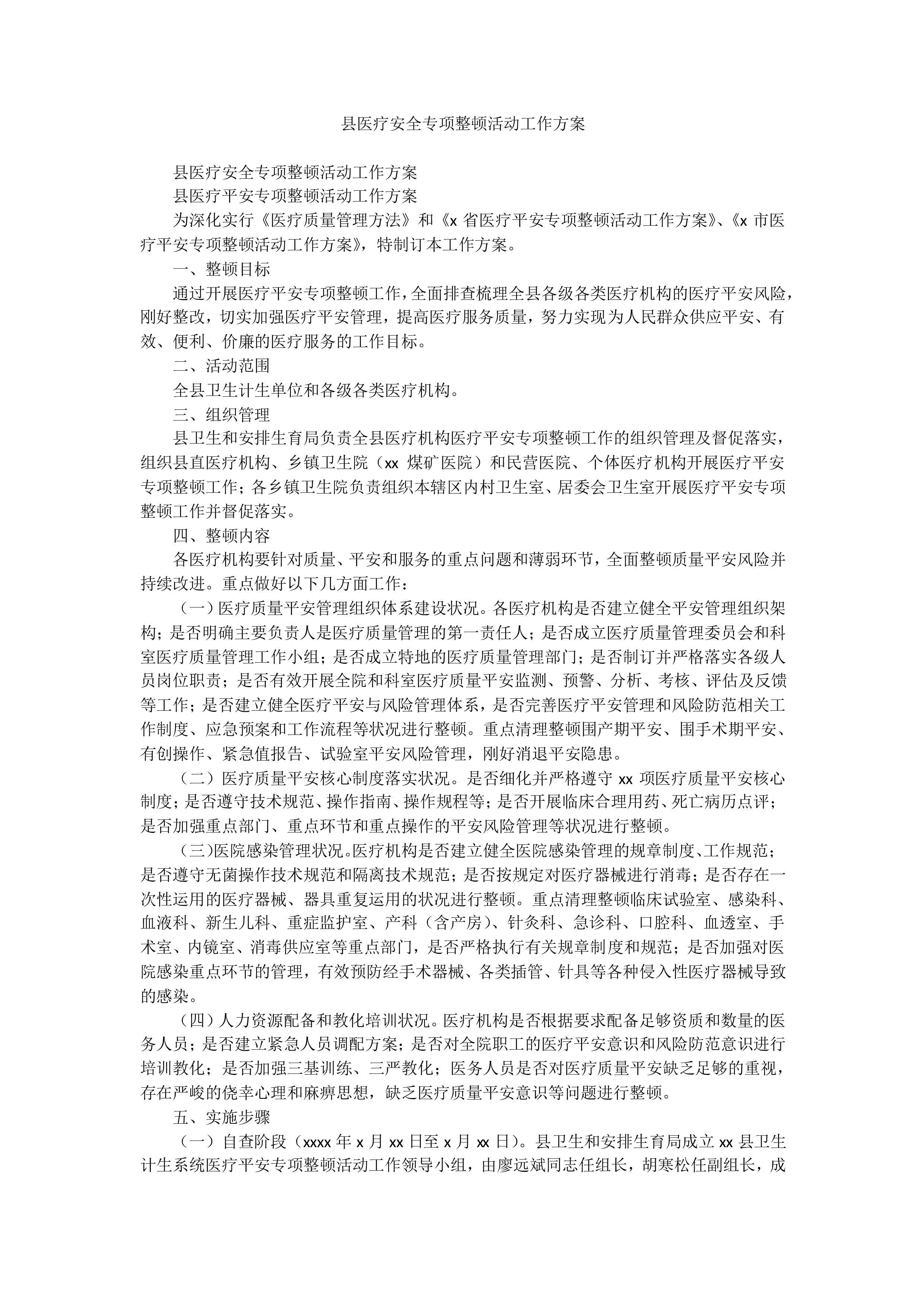 县医疗安全专项整顿活动工作方案县医疗安全专项整顿活动工作方案县医疗平安专项整顿活动工作方案为深化实行《医疗质量管理方法》和《x省医疗平安专项整顿活动工作方案》、《x市医疗平安专项整顿活动工作方案》,特制订本工作方案。一、整顿目标通过开展医疗平安专项整顿工作,全面排查梳理全县各级各类医疗机构的医疗平安风险,刚好整改,切实加强医疗平安管理,提高医疗服务质量,努力实现为人民群众供应平安、有效、便利、价廉的医疗服务的工作目标。二、活动范围全县卫生计生单位和各级各类医疗机构。三、组织管理县卫生和安排生育局负责全县医疗机构医疗平安专项整顿工作的组织管理及督促落实,组织县直医疗机构、乡镇卫生院(xx煤矿