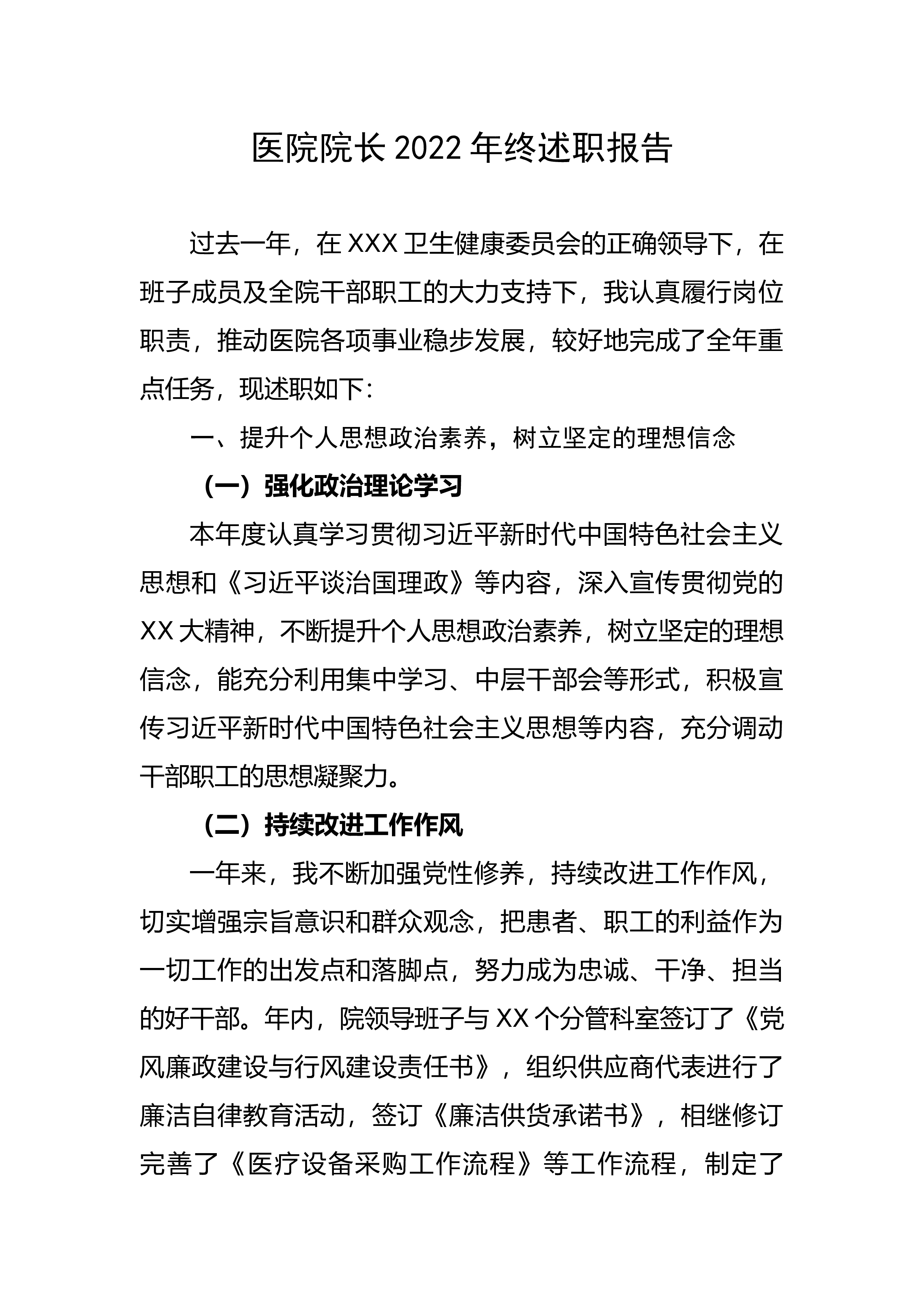 院长2022年终述职报告过去一年,在XXX卫生健康委员会的正确领导下,在班子成员及全院干部职工的大力支持下,我认真履行岗位职责,推动
