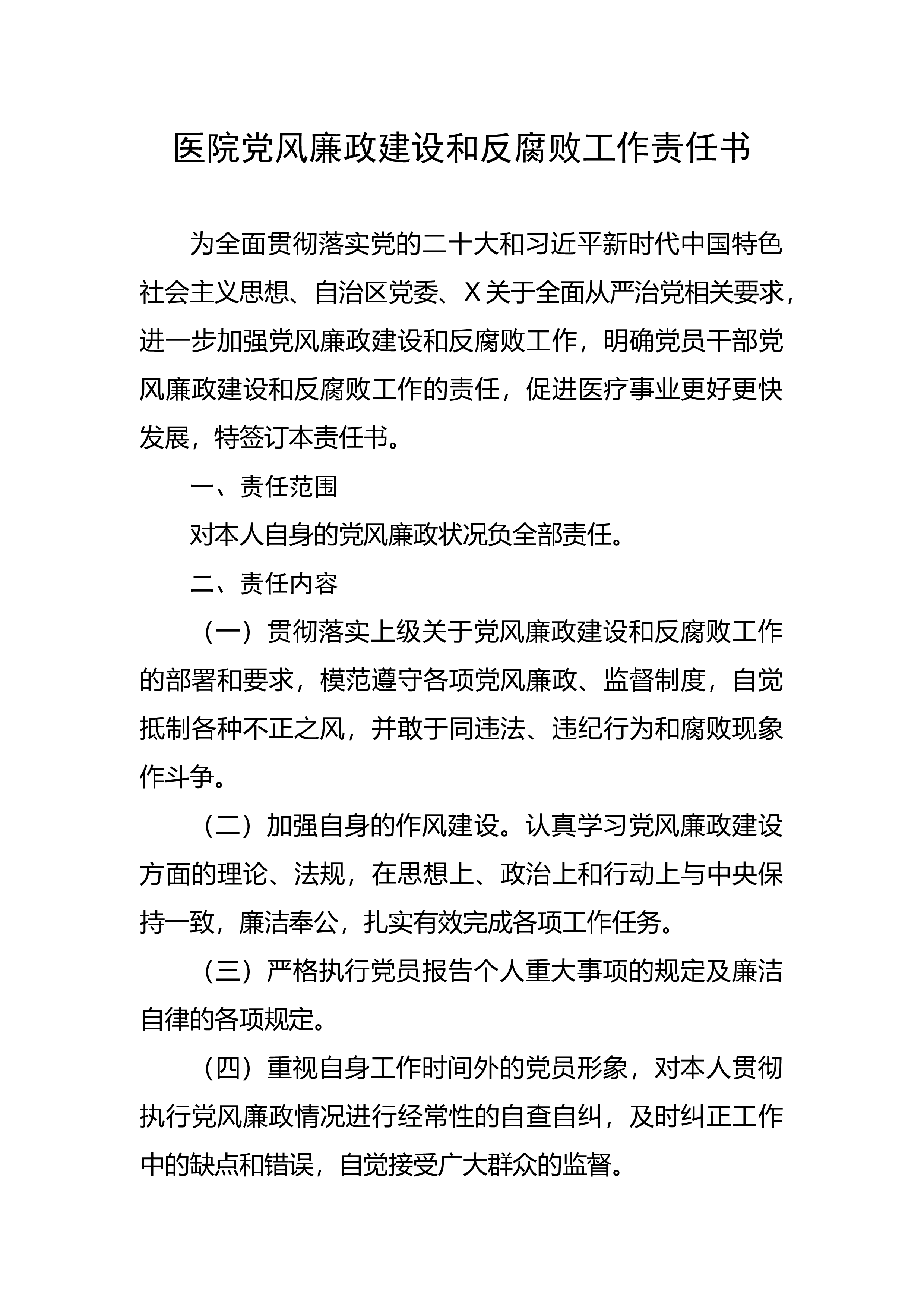 党风廉政建设和反腐败工作责任书为全面贯彻落实党的二十大和习近平新时代中国特色社会主义思想、自治区党委、X关于全面从严治党相关要求,进一步加强党风廉政建设和反腐败工作,明确党员干部党风廉政建设和反腐败工作的责任,促进医疗事业更好更快发展,特签订本责任书。一、责任范围对本人自身的党风廉政状况负全部责任。二、责任内容(一)贯彻落实上级关于党风廉政建设和反腐败工作的部署和要求,模范遵守各项党风廉政、监督制度,自觉抵制各种不正之风,并敢于同违法、违纪行为和腐败现象作斗争。(二)加强自身的作风建设。认真学习党风廉政建设方面的理论、法规,在思想上、政治上和行动上与中央保持一致,廉洁奉公,扎实有效完成各项...