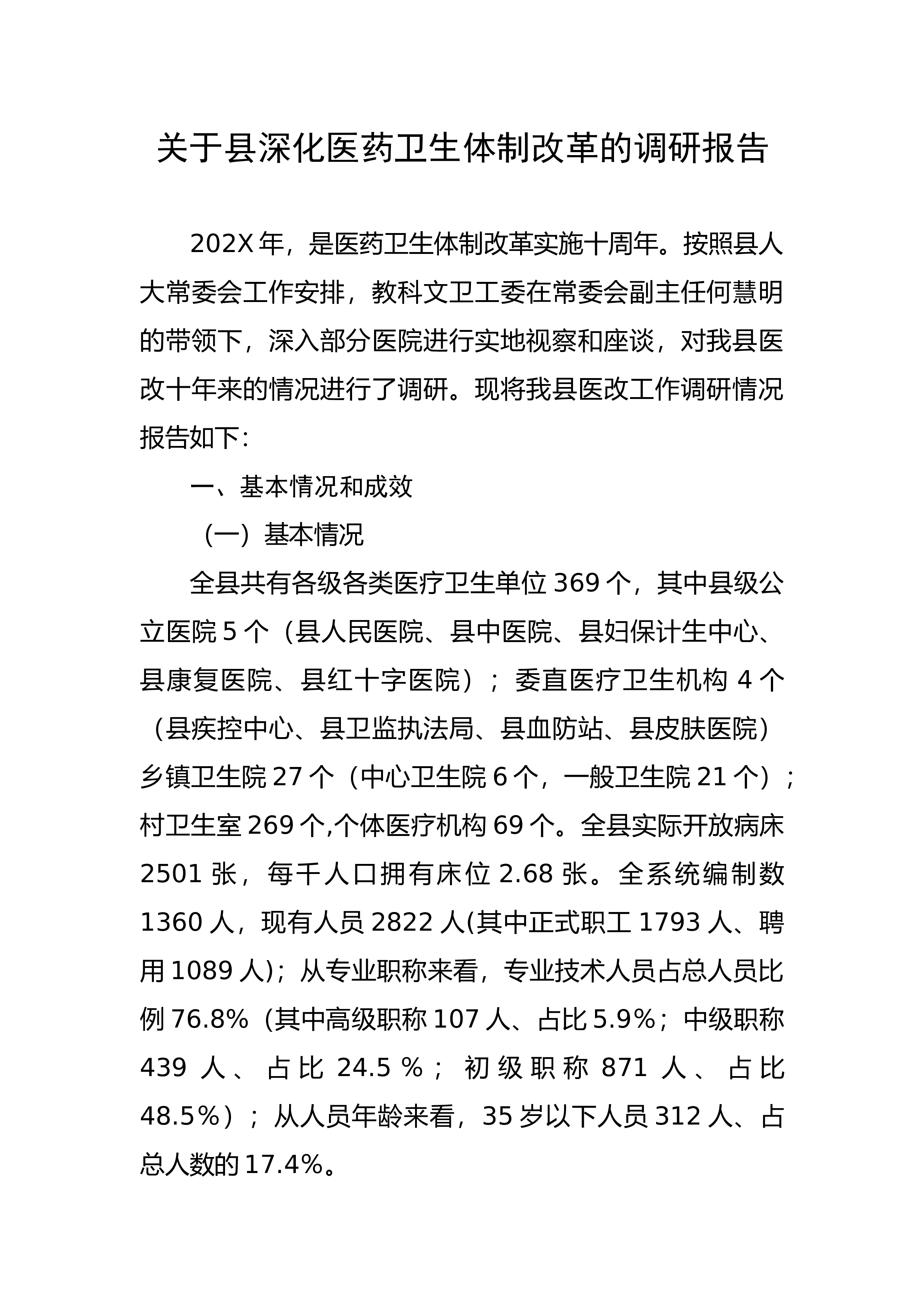 关于县深化医药卫生体制改革的调研报告202X年,是医药卫生体制改革实施十周年。按照县人大常委会工作安排,教科文卫工委在常委会副主任何慧明的带领下,深入部分医院进行实地视察和座谈,对我县医改十年来的情况进行了调研。现将我县医改工作调研情况报告如下:一、基本情况和成效(一)基本情况全县共有各级各类医疗卫生单位369个,其中县级公立医院5个(县人民医院、县中医院、县妇保计生中心、县康复医院、县红十字医院);委直医疗卫生机构4个(县疾控中心、县卫监执法局、县血防站、县皮肤医院)乡镇卫生院27个(中心卫生院6个,一般卫生院21个);村卫生室269个,个体医疗机构69个。全县实际开放病床2501张,每千人...