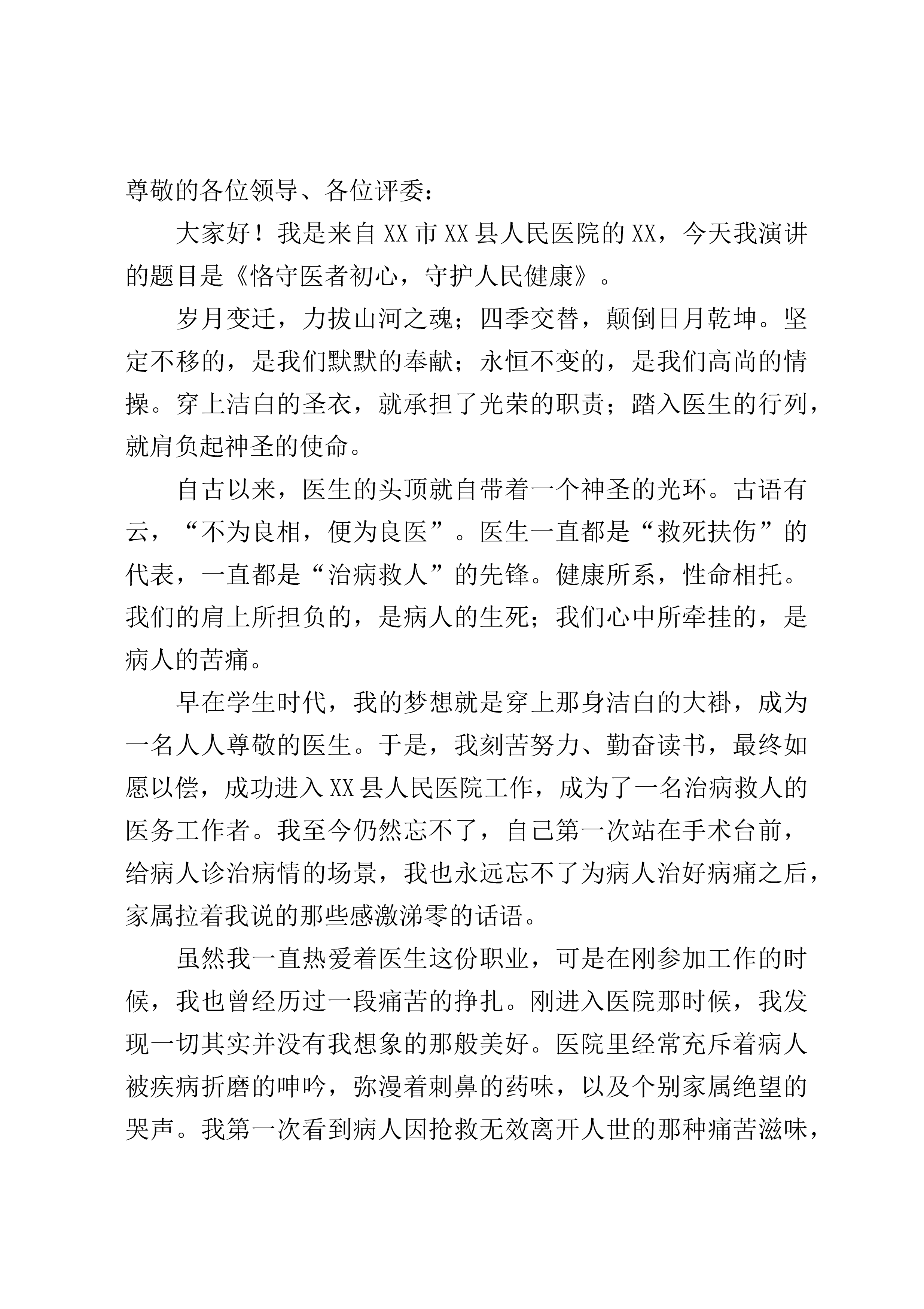 的XX,今天我演讲的题目是《恪守医者初心,守护人民健康》。岁月变迁,力拔山河之魂;四季交替,颠倒日月乾坤。坚定不移的,是我们默默的奉献;永恒不变的,是我们高尚的情操。穿上洁白的圣衣,就承担了光荣的职责;踏入医生的行列,就肩负起神圣的使命。自古以来,医生的头顶就自带着一个神圣的光环。古语有云,“不为良相,便为良医”。医生一直都是“救死扶伤”的代表,一直都是“治病救人”的先锋。健康所系,性命相托。我们的肩上所担负的,是病人的生死;我们心中所牵挂的,是病人的苦痛。早在学生时代,我的梦想就是穿上那身洁白的大褂,成为一名人人尊敬的医生。于是,...