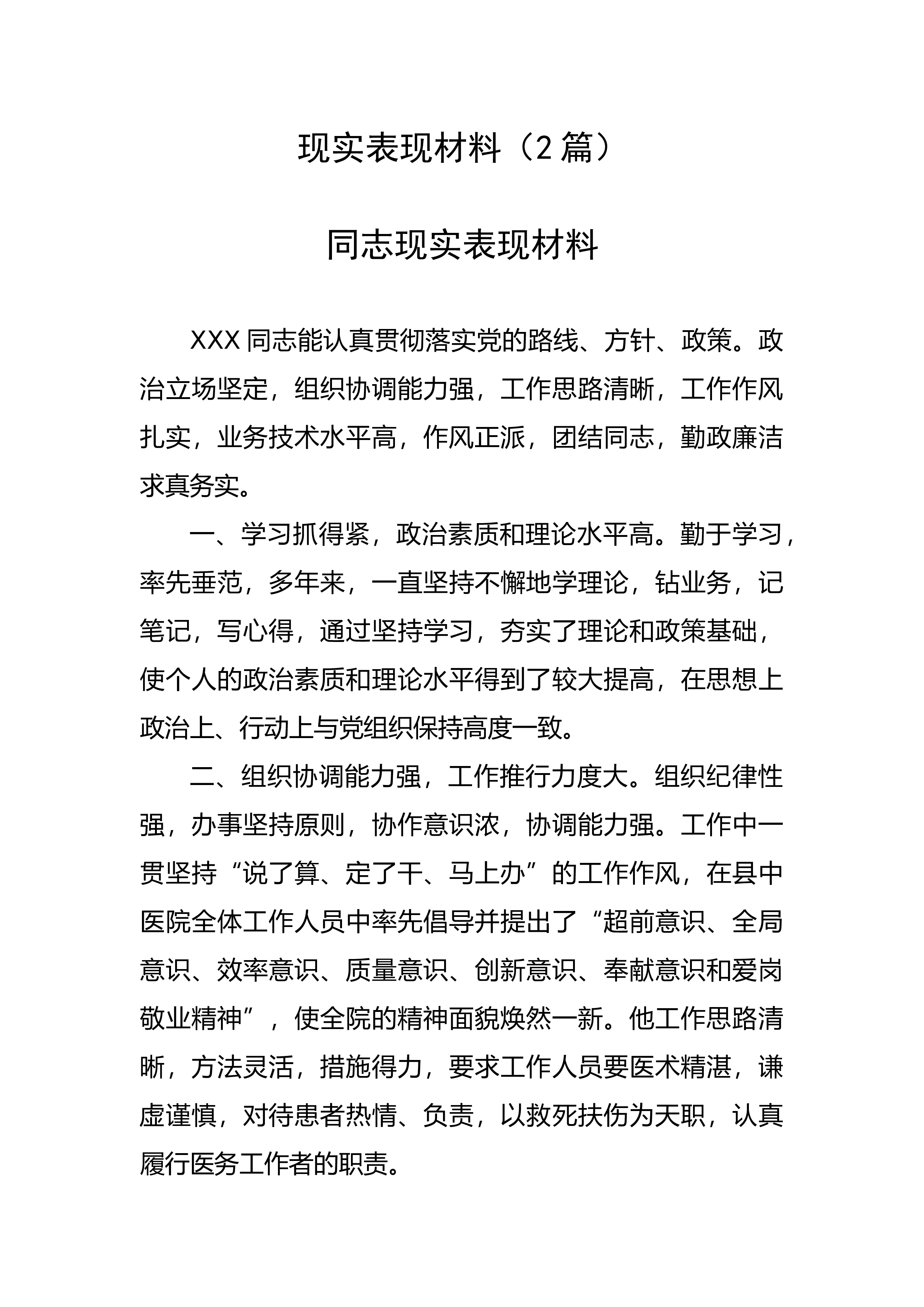 现实表现材料(2篇)同志现实表现材料XXX同志能认真贯彻落实党的路线、方针、政策。政治立场坚定,组织协调能力强,工作思路清晰,工作作风扎实,业务技术水平高,作风正派,团结同志,勤政廉洁求真务实。一、学习抓得紧,政治素质和理论水平高。勤于学习,率先垂范,多年来,一直坚持不懈地学理论,钻业务,记笔记,写心得,通过坚持学习,夯实了理论和政策基础,使个人的政治素质和理论水平得到了较大提高,在思想上政治上、行动上与党组织保持高度一致。二、组织协调能力强,工作推行力度大。组织纪律性强,办事坚持原则,协作意识浓,协调能力强。工作中一贯坚持“说了算、定了干、马上办”的工作作风,在县中