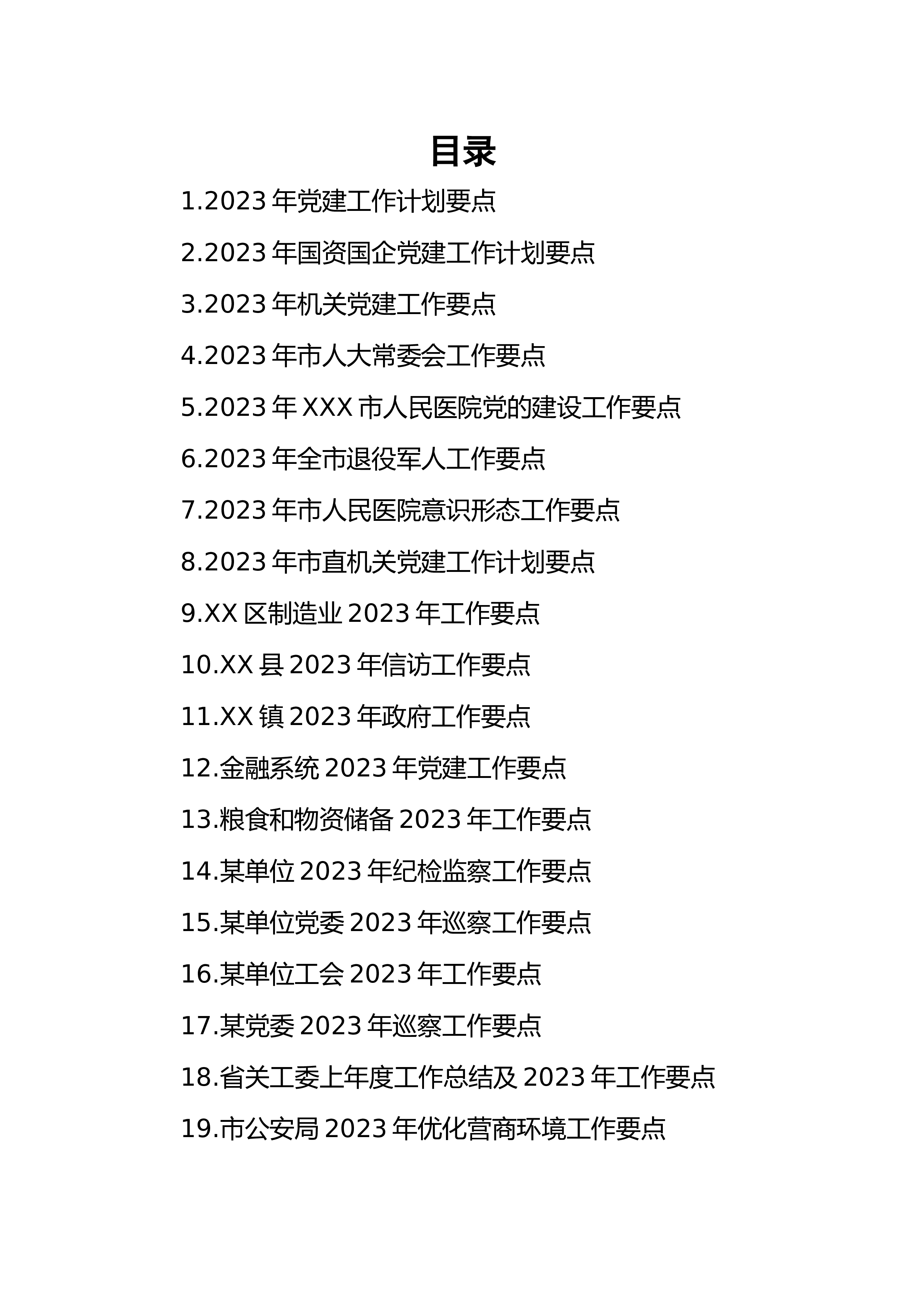 目录1.2023年党建工作计划要点2.2023年国资国企党建工作计划要点3.2023年机关党建工作要点4.2023年市人大常委会工作要点5.2023年XXX市人民