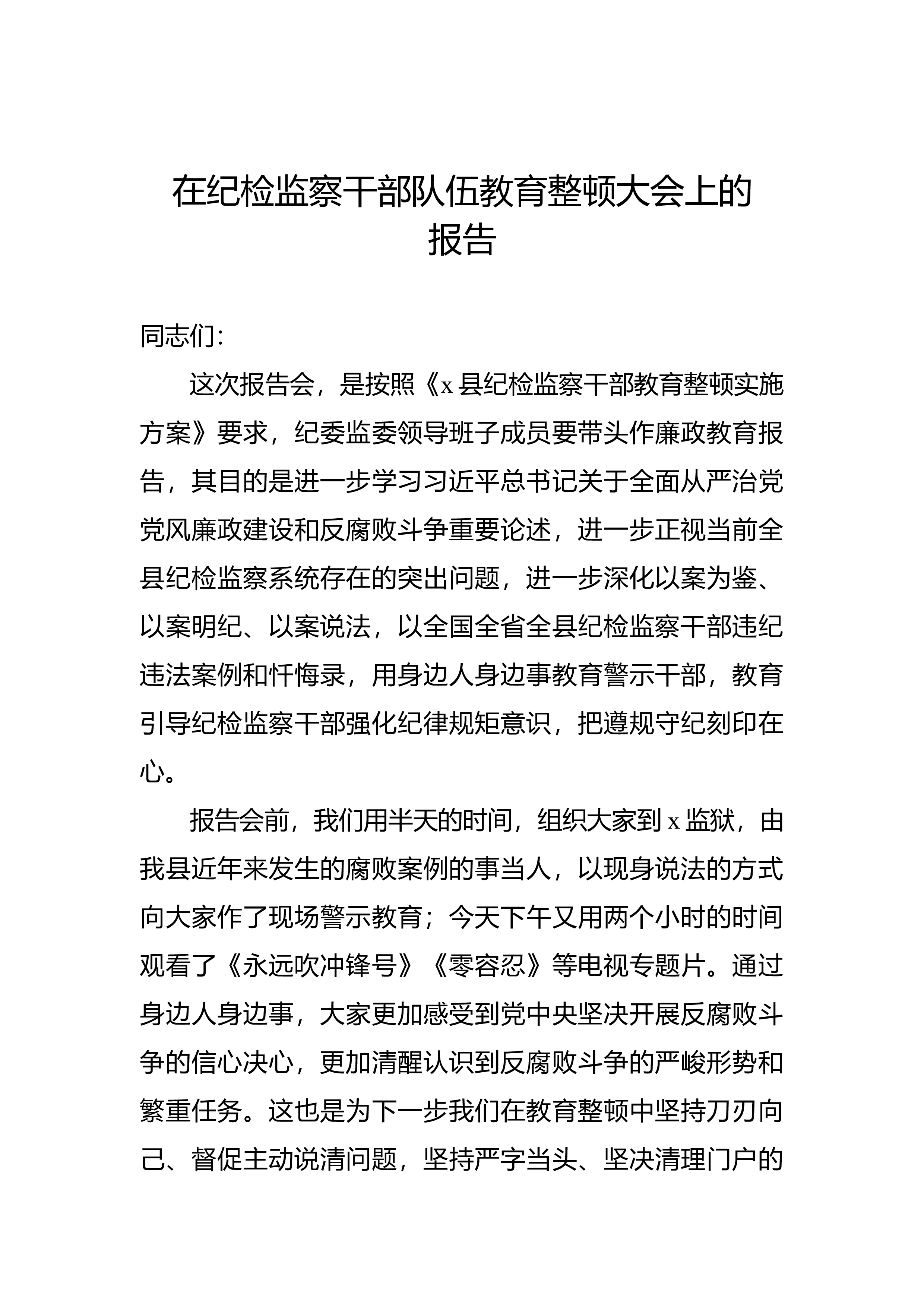 在纪检监察干部队伍教育整顿大会上的报告同志们:这次报告会,是按照《x县纪检监察干部教育整顿实施方案》要求,纪委监委领导班子成员要带头作廉政教育报告,其目的是进一步学习习近平总书记关于全面从严治党党风廉政建设和反腐败斗争重要论述,进一步正视当前全县纪检监察系统存在的突出问题,进一步深化以案为鉴、以案明纪、以案说法,以全国全省全县纪检监察干部违纪违法案例和忏悔录,用身边人身边事教育警示干部,教育引导纪检监察干部强化纪律规矩意识,把遵规守纪刻印在心。报告会前,我们用半天的时间,组织大家到x监狱,由我县近年来发生的腐败案例的事当人,以现身说法的方式向大家作了现场警示教育;今天下午又用两个小时的时间观看...
