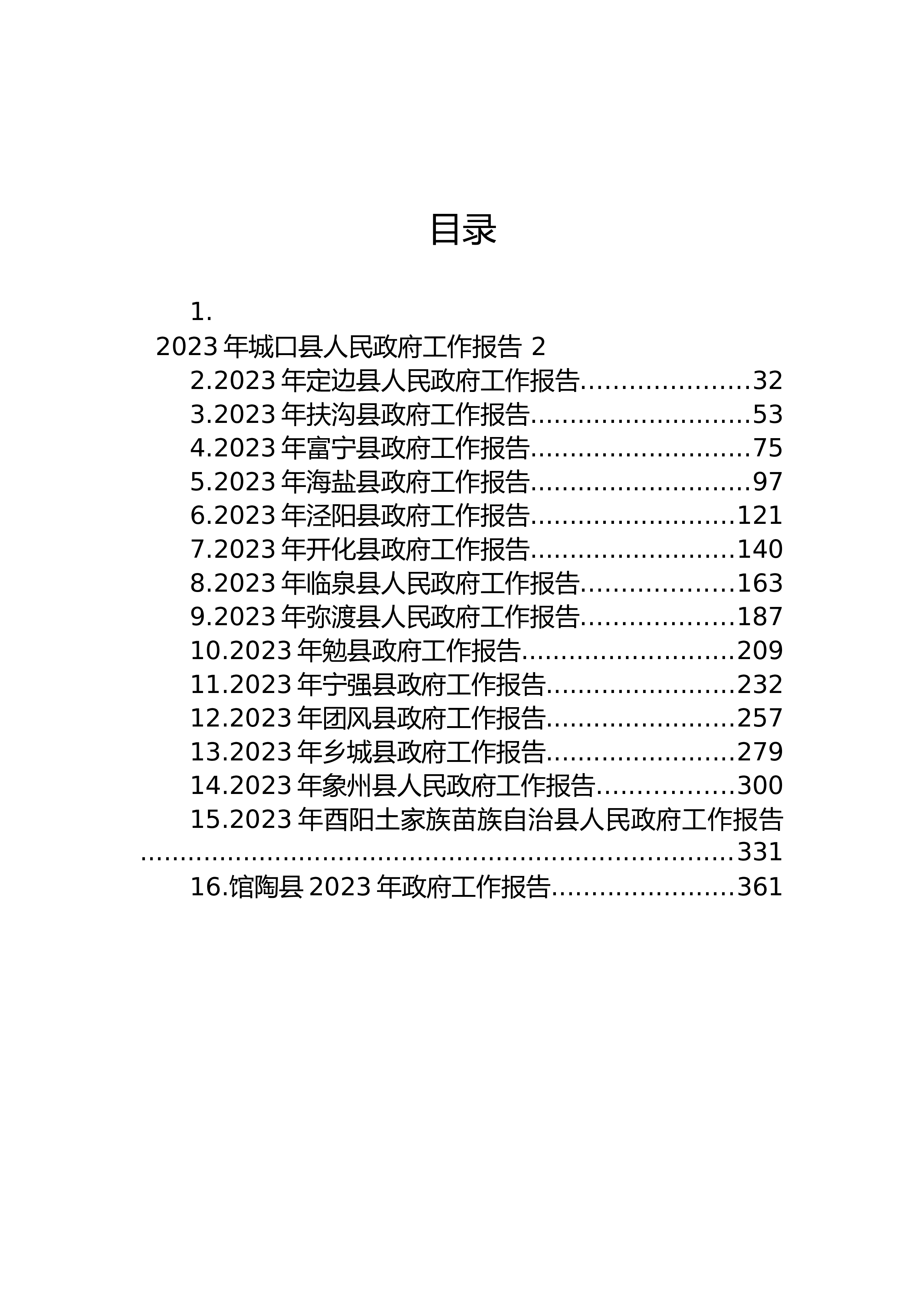 目录1.2023年城口县人民政府工作报告22.2023年定边县人民政府工作报告.....................323.2023年扶沟县政府工作报告............................534.2023年富宁县政府工作报告............................755.2023年海盐县政府工作报告............................976.2023年泾阳县政府工作报告..........................1217.2023年开化县政府工作报告..........................1408.2023年临泉县...