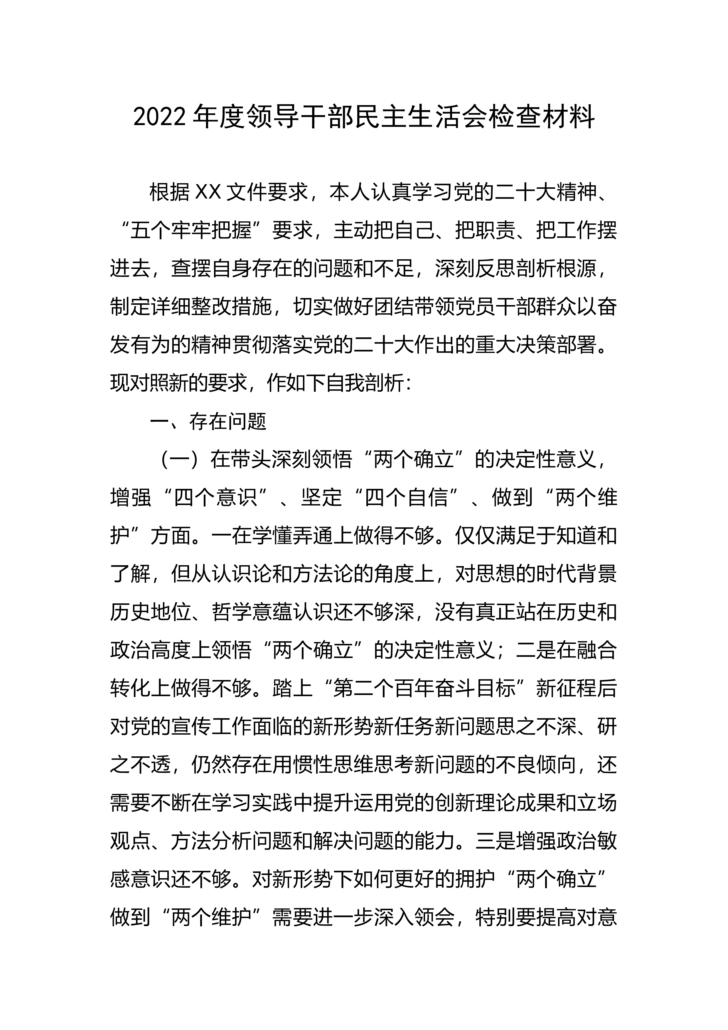 2022年度领导干部民主生活会检查材料根据XX文件要求,本人认真学习党的二十大精神、“五个牢牢把握”要求,主动把自己、把职责、把工作摆进去,查摆自身存在的问题和不足,深刻反思剖析根源,制定详细