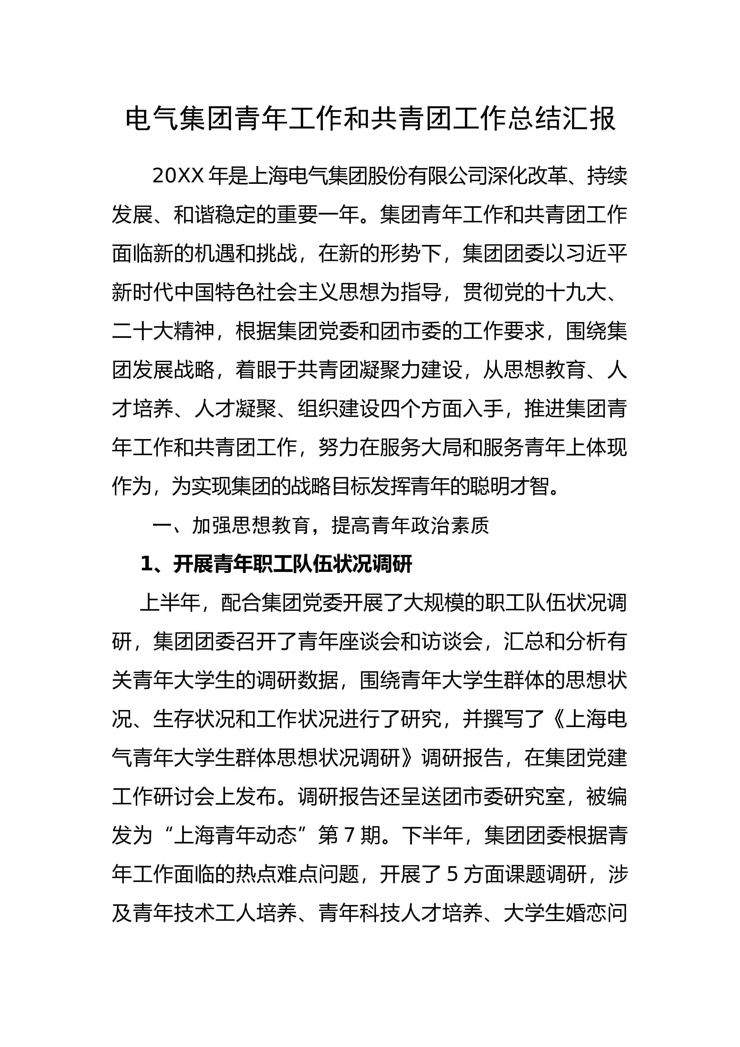 电气集团青年工作和共青团工作总结汇报20XX年是上海电气集团股份有限公司深化改革、持续发展、和谐稳定的重要一年。集团青年工作和共青团工作面临新的机遇和挑战,在新的形势下,集团团委以习近平新时代中国特色社会主义思想为指导,贯彻党的十九大、二十大精神,根据集团党委和团市委的工作要求,围绕集团发展战略,着眼于共青团凝聚力建设,从思想教育、人才培养、人才凝聚、组织建设四个方面入手,推进集团青年工作和共青团工作,努力在服务大局和服务青年上体现作为,为实现集团的战略目标发挥青年的聪明才智。一、加强思想教育,提高青年