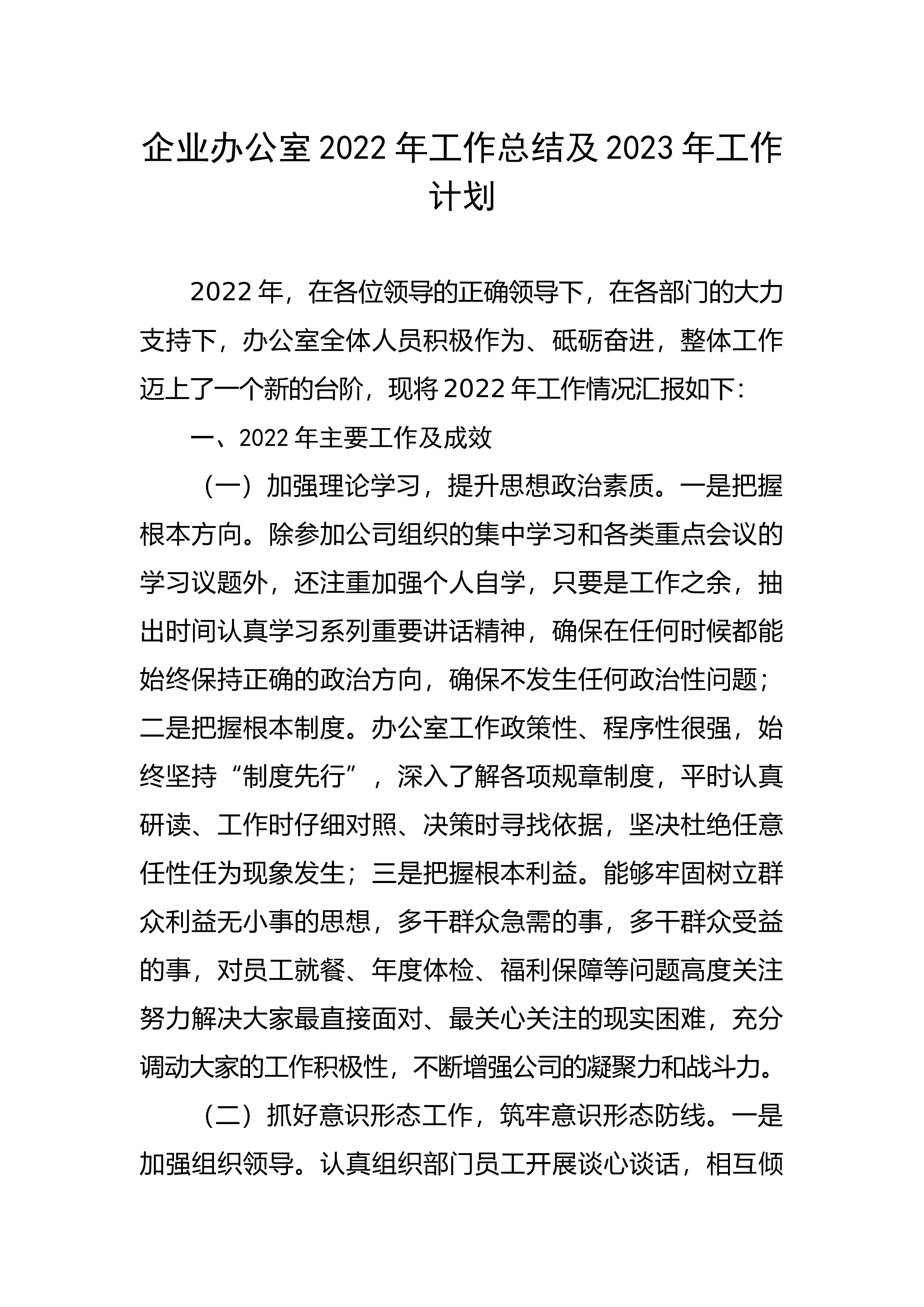 企业办公室2022年工作总结及2023年工作计划2022年,在各位领导的正确领导下,在各部门的大力支持下,办公室全体人员积极作为、砥砺奋进,整体工作迈上了一个新的台阶,现将2022年工作情况汇报如下:一、2022年主要工作及成效(一)加强理论学习,提升思想