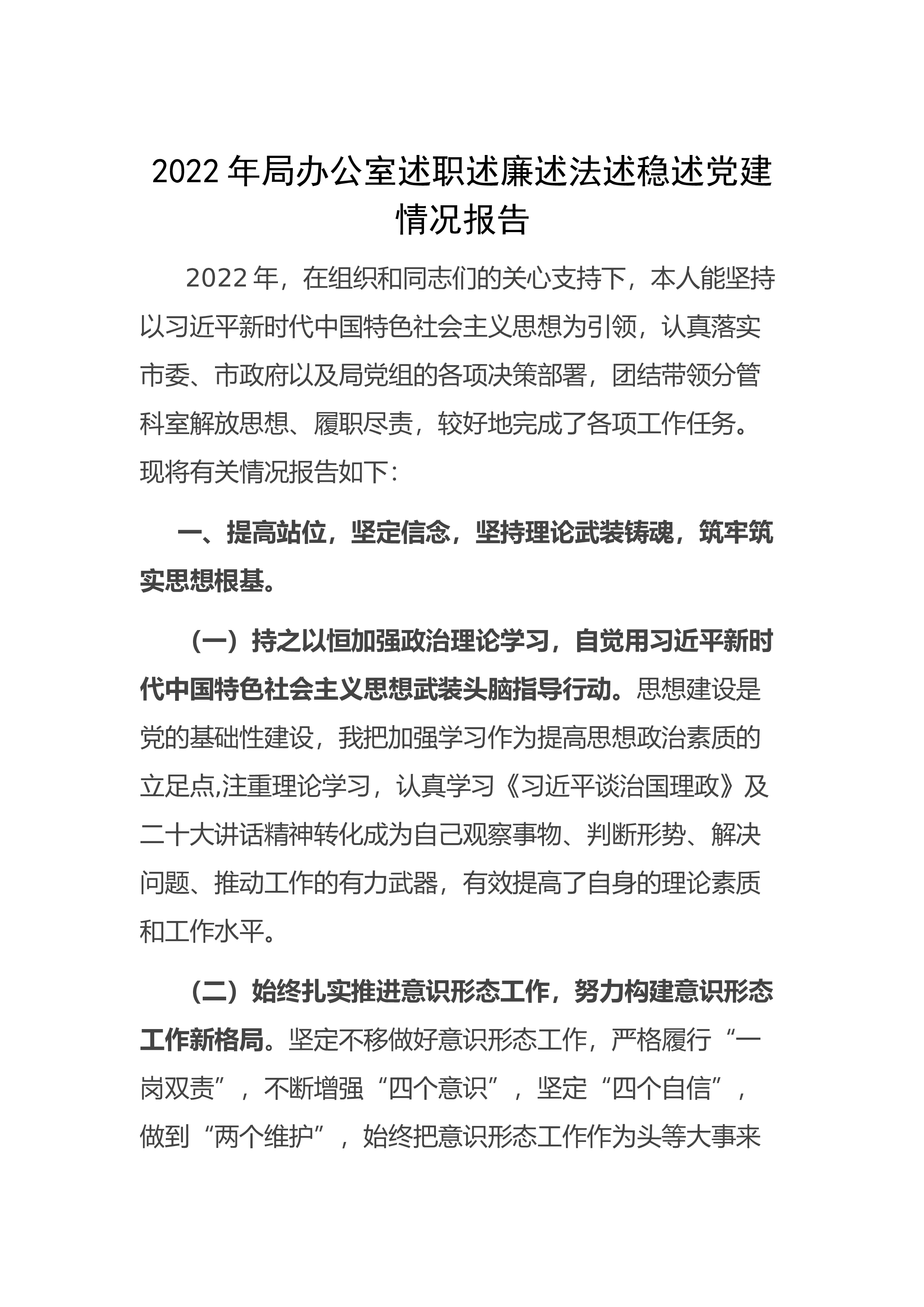 2022年局办公室述职述廉述法述稳述党建情况报告 2022年,在组织和同志们的关心支持下,本人能坚持以习近平新时代中国特色社会主义思想为引领,认真落实市委、市政府以及局党组的各项决策部署,团结带领分管科室解放思想、履职尽责,较好地完成了各项工作任务。现将有关情况报告如下:一、提高站位,坚定信念,坚持理论武装铸魂,筑牢筑实思想根基。(一)持之以恒加强政治理论学习,自觉用习近平新时代中国特色社会主义思想武装头脑指导行动。思想建设是党的基础性建设,我把加强学习作为提高思想政治素质的立足点,注重理论学习,认真学习《习近平谈治国理政》及二十大讲话精神转化成为自己观察事物、判断形势、解决问题、推动工作的有...