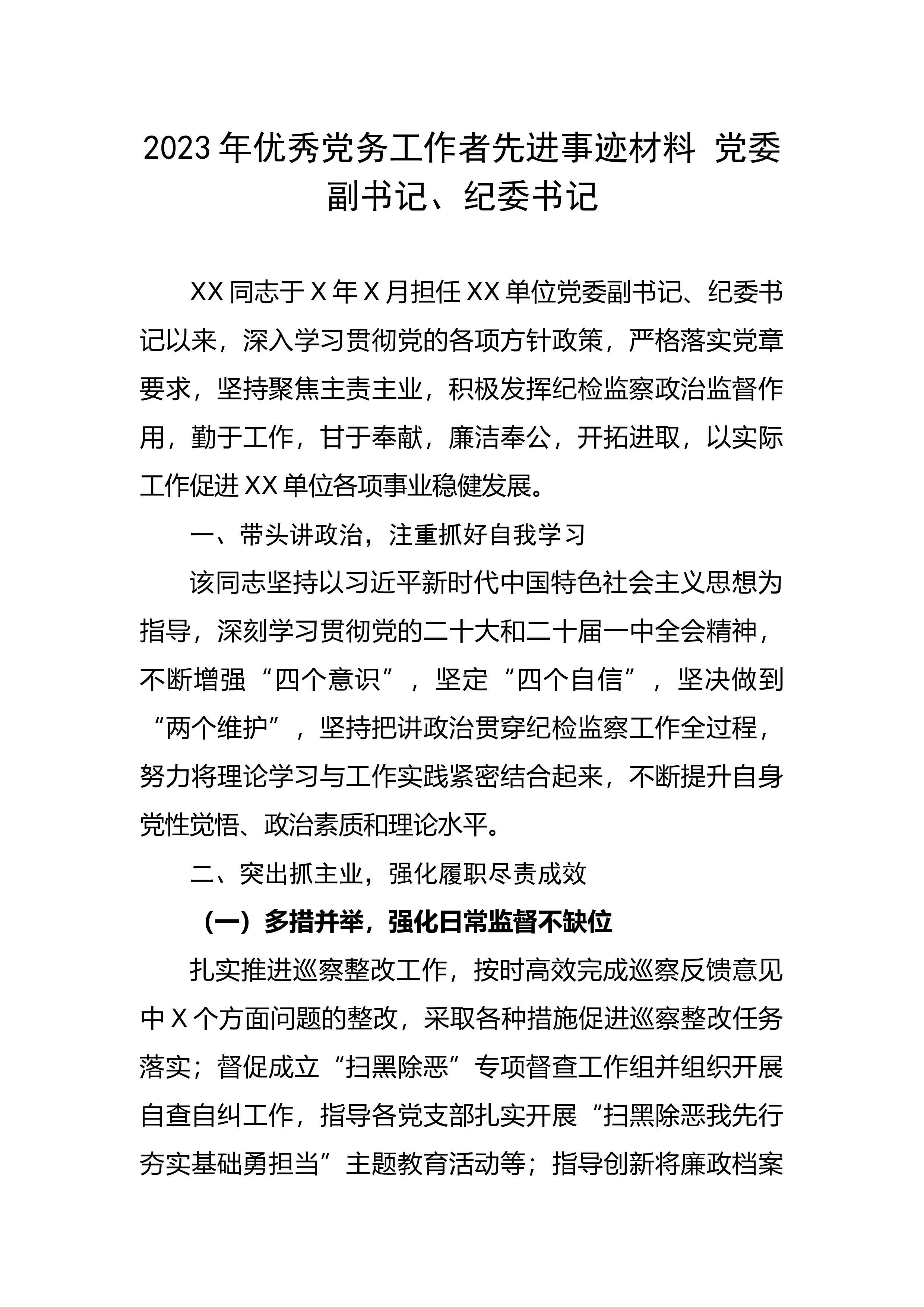 2023年优秀党务工作者先进事迹材料党委副书记、纪委书记XX同志于X年X月担任XX单位党委副书记、纪委书记以来,深入学习贯彻党的各项方针政策,严格落实党章要求,坚持聚焦主责主业,积极发挥纪检监察政治监督作用,勤于工作,甘于奉献,廉洁奉公,开拓进取,以实际工作促进XX单位各项事业稳健发展。一、带头讲政治,注重抓好自我学习该同志坚持以习近平新时代中国特色社会主义思想为指导,深刻学习贯彻党的二十大和二十届一中全会精神,不断增强“四个意识”,坚定“四个自信”,坚决做到“两个维护”,坚持把讲政治贯穿纪检监察工作全过程,努力将理论学习与工作实践紧密结合起来,不断提升自身党性觉悟、