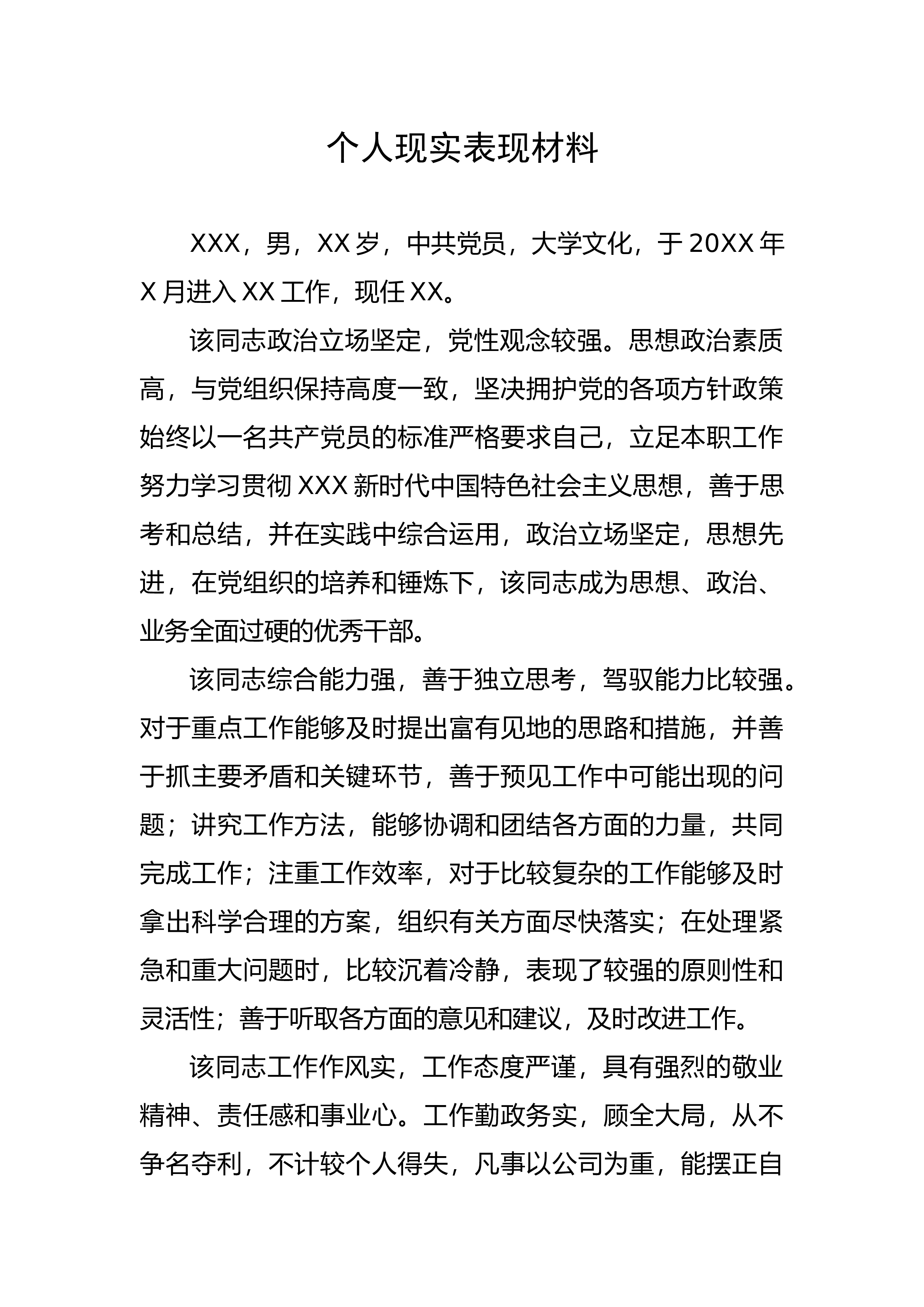 个人现实表现材料XXX,男,XX岁,中共党员,大学文化,于20XX年X月进入XX工作,现任XX。该同志政治立场坚定,党性观念较强。思想