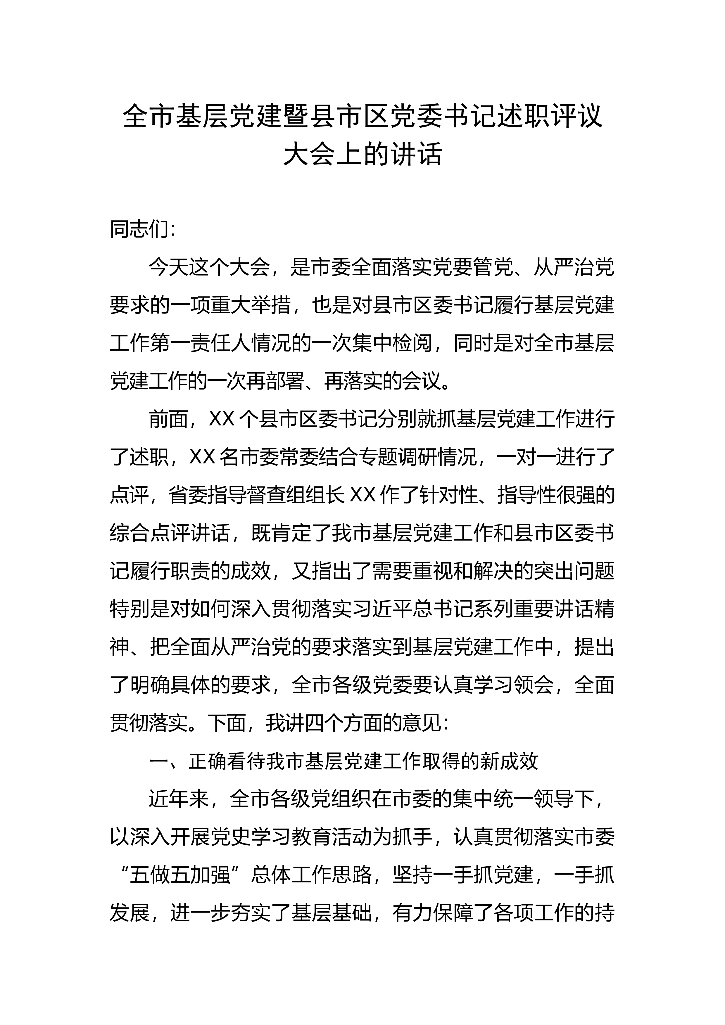 全市基层党建暨县市区党委书记述职评议大会上的讲话同志们:今天这个大会,是市委全面落实党要管党、从严治党要求的一项重大举措,也是对县市区委书记履行基层党建工作第一责任人情况的一次集中检阅,同时是对全市基层党建工作的一次再部署、再落实的会议。前面,XX个县市区委书记分别就抓基层党建工作进行了述职,XX名市委常委结合专题调研情况,一对一进行了点评,省委指导督查组组长XX作了针对性、指导性很强的综合点评讲话,既肯定了我市基层党建工作和县市区委书记履行职责的成效,又指出了需要重视和解决的突出问题特别是对如何深入贯彻落实习近平总书记系列重要讲话精神、把全面从严治党的要求落实到基层党建工作中,提出了明确具体...