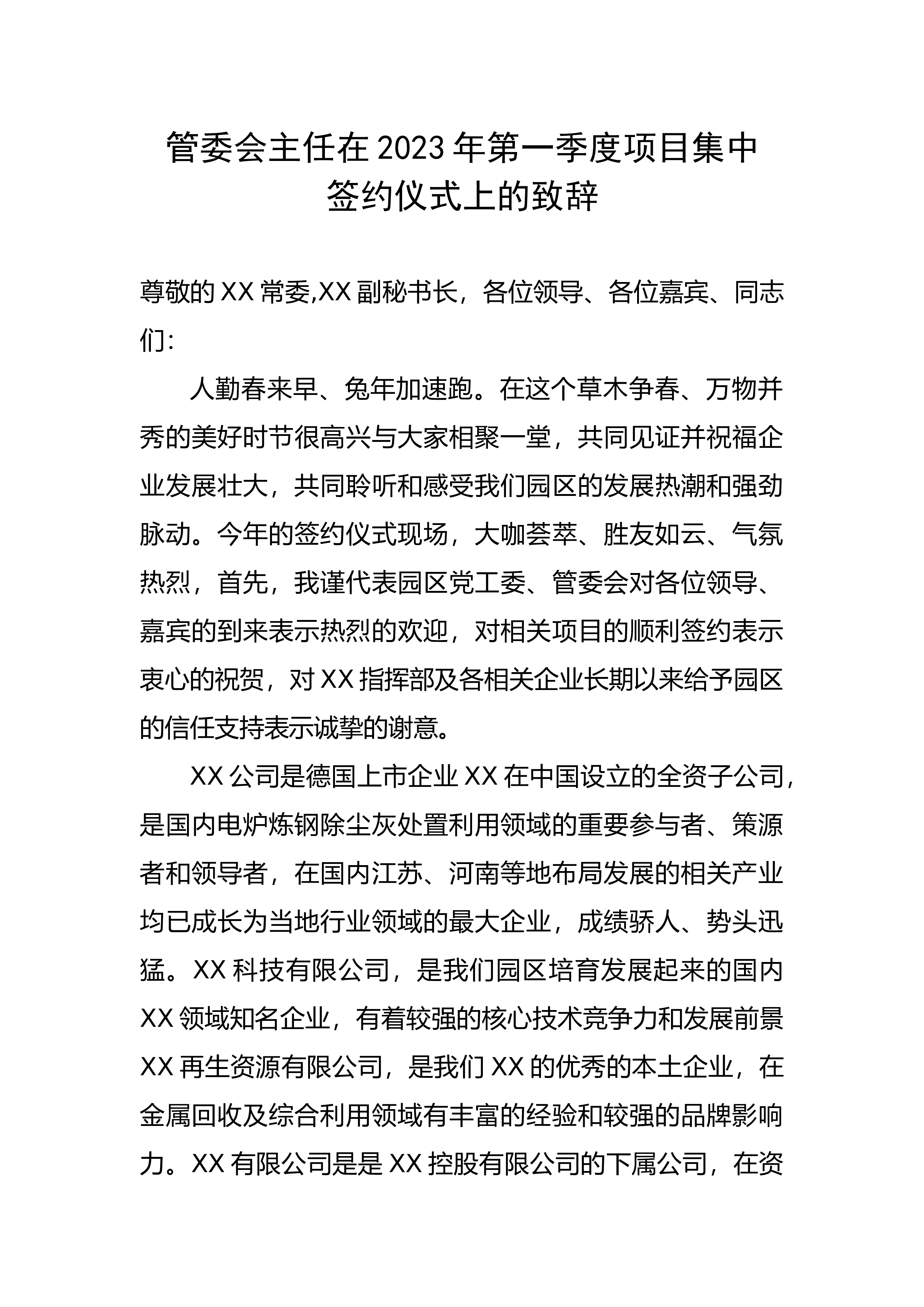 管委会主任在2023年第一季度项目集中签约仪式上的致辞尊敬的XX常委,XX副秘书长,各位领导、各位嘉宾、同志们:人勤春来早、兔年加速跑。在这个草木争春、万物并秀的美好时节很高兴与大家相聚一堂,共同见证并祝福企业发展壮大,共同聆听和感受我们园区的发展热潮和强劲脉动。今年的签约仪式现场,大咖荟萃、胜友如云、气氛热烈,首先,我谨代表园区党工委、管委会对各位领导、嘉宾的到来表示热烈的欢迎,对相关项目的顺利签约表示衷心的祝贺,对XX指挥部及各相关企业长期以来给予园区的信任支持表示诚挚的谢意。XX公司是德国上市企业XX在中国设立的全资子公司,是国内电炉炼钢除尘灰处置利用领域的重要参与者、策源者和领导者,在...