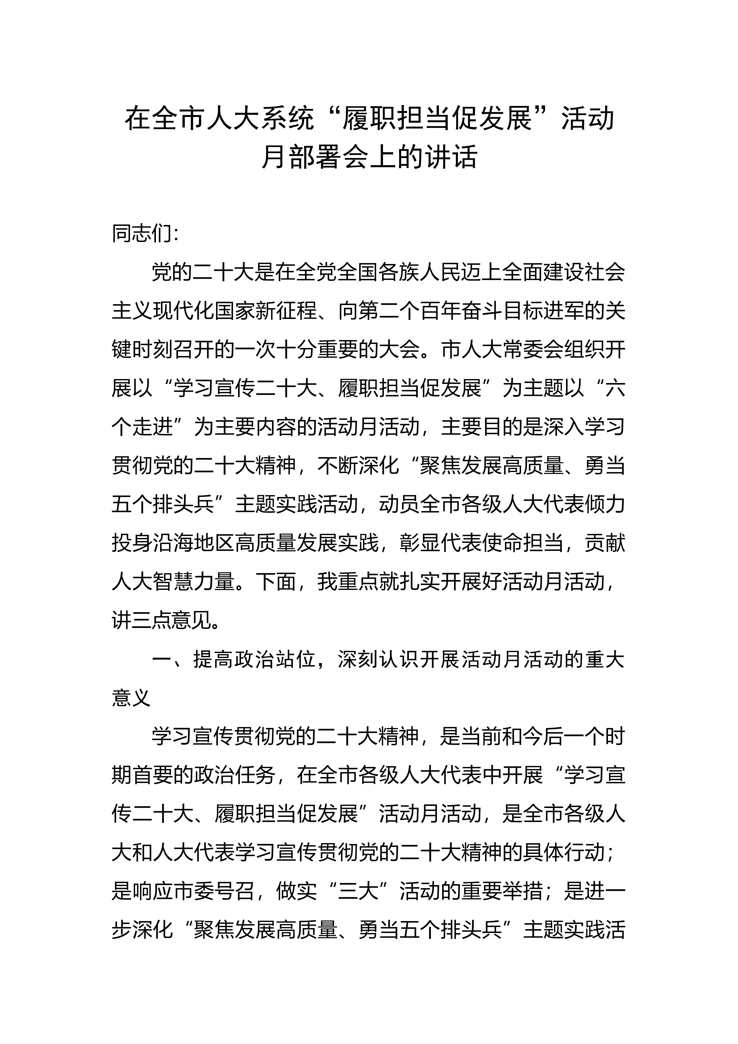 在全市人大系统“履职担当促发展”活动月部署会上的讲话同志们:党的二十大是在全党全国各族人民迈上全面建设社会主义现代化国家新征程、向第二个百年奋斗目标进军的关键时刻召开的一次十分重要的大会。市人大常委会组织开展以“学习宣传二十大、履职担当促发展”为主题以“六个走进”为主要内容的活动月活动,主要目的是深入学习贯彻党的二十大精神,不断深化“聚焦发展高质量、勇当五个排头兵”主题实践活动,动员全市各级人大代表倾力投身沿海地区高质量发展实践,彰显代表使命担当,贡献人大智慧力量。下面,我重点就扎实开展好活动月活动,讲三点意见。一、提高政治站位,深刻认识开展活动月活动的重大意义学习宣传贯彻党的二十大精神,是当...