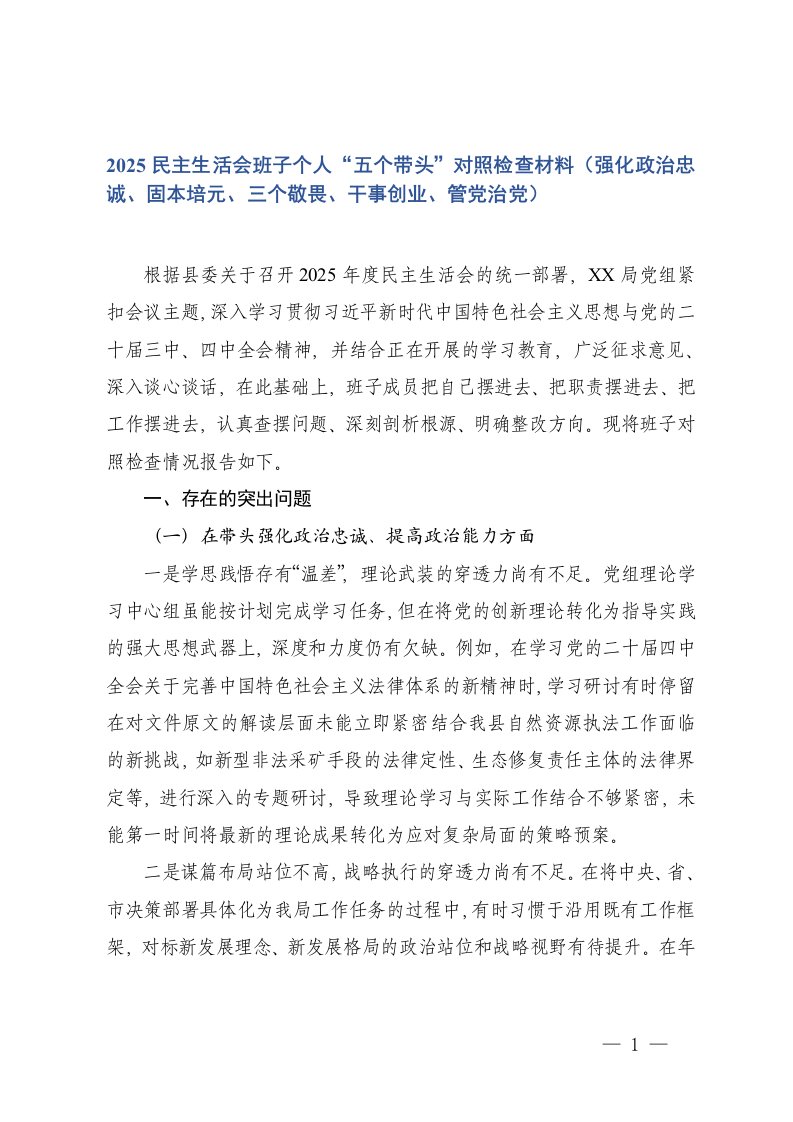 2025年民主生活会五个带头对照检查发言材料筑牢忠诚夯实思想恪守立场奋发有为压实责任 (1)