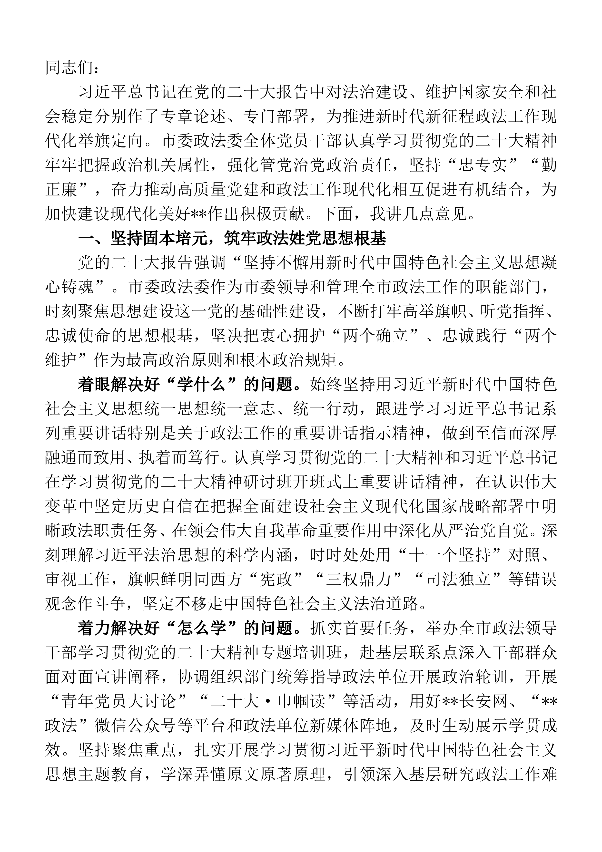 同志们:开展学习贯彻习近平新时代中国特色社会主义思想主T教育,是党的二十大做出的战略部署,是统一全党思想意志行动,推动全党积极担当作为,以党的自我革命引领社会革命的必然要求。**是习近平总书记亲临视察、点赞勉励的城市,我们把对总书记的崇敬之情、爱戴之情、感恩之情和忠诚之心转化为抓好主T教育的高度自觉和强大动能,牢牢把握“学思想、强党性、重实践、建新功”总要求,按照**省委“第二批参加主T教育单位要早谋划、早热身,跟进学起来、做起来、改起来”的要求,立足高站位,坚持高标准,超前谋划和推进有关工作,切实做到与第一批参加主T教育单位同步学习、同步调研、同步整改,真正使主T教育成为一次思想的再洗礼、初...