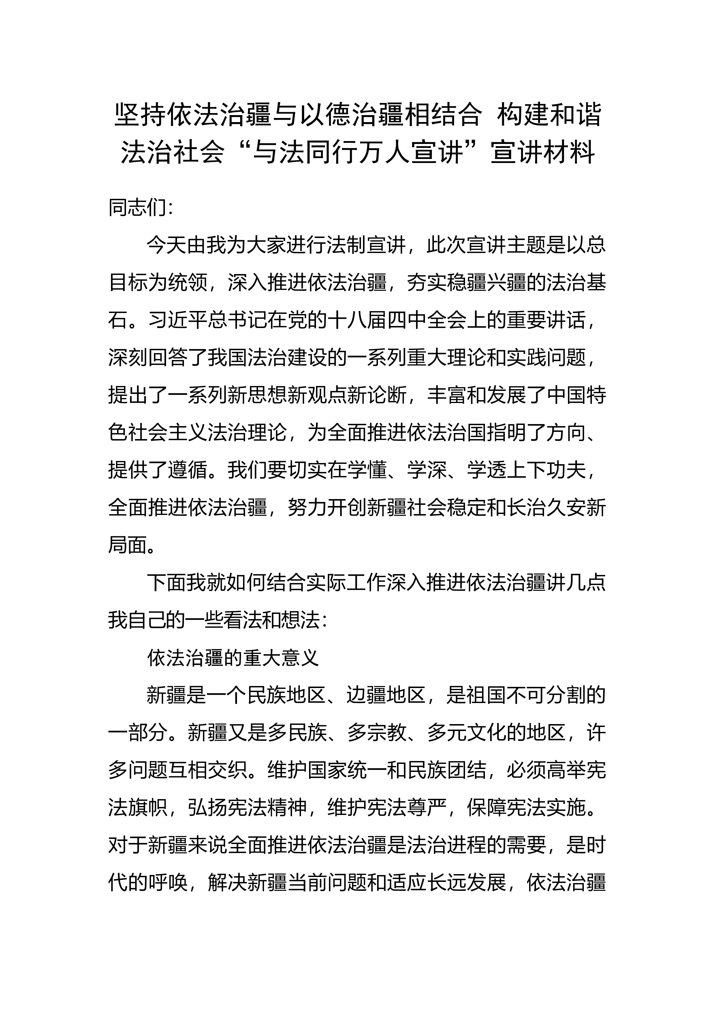 坚持依法治疆与以德治疆相结合构建和谐法治社会“与法同行万人宣讲”宣讲材料同志们:今天由我为大家进行法制宣讲,此次宣讲主题是以总目标为统领,深入推进依法治疆,夯实稳疆兴疆的法治基石。习近平总书记在党的十八届四中全会上的重要讲话,深刻回答了我国法治建设的一系列重大理论和实践问题,提出了一系列新思想新观点新论断,丰富和发展了中国特色社会主义法治理论,为全面推进依法治国指明了方向、提供了遵循。我们要切实在学懂、学深、学透上下功夫,全面推进依法治疆,努力开创新疆社会稳定和长治久安新局面。下面我就如何结合实际工作深入推进依法治疆讲几点我自己的一些看法和想法:依法治疆的重大意义新疆是一个民族地区、边疆地区,...