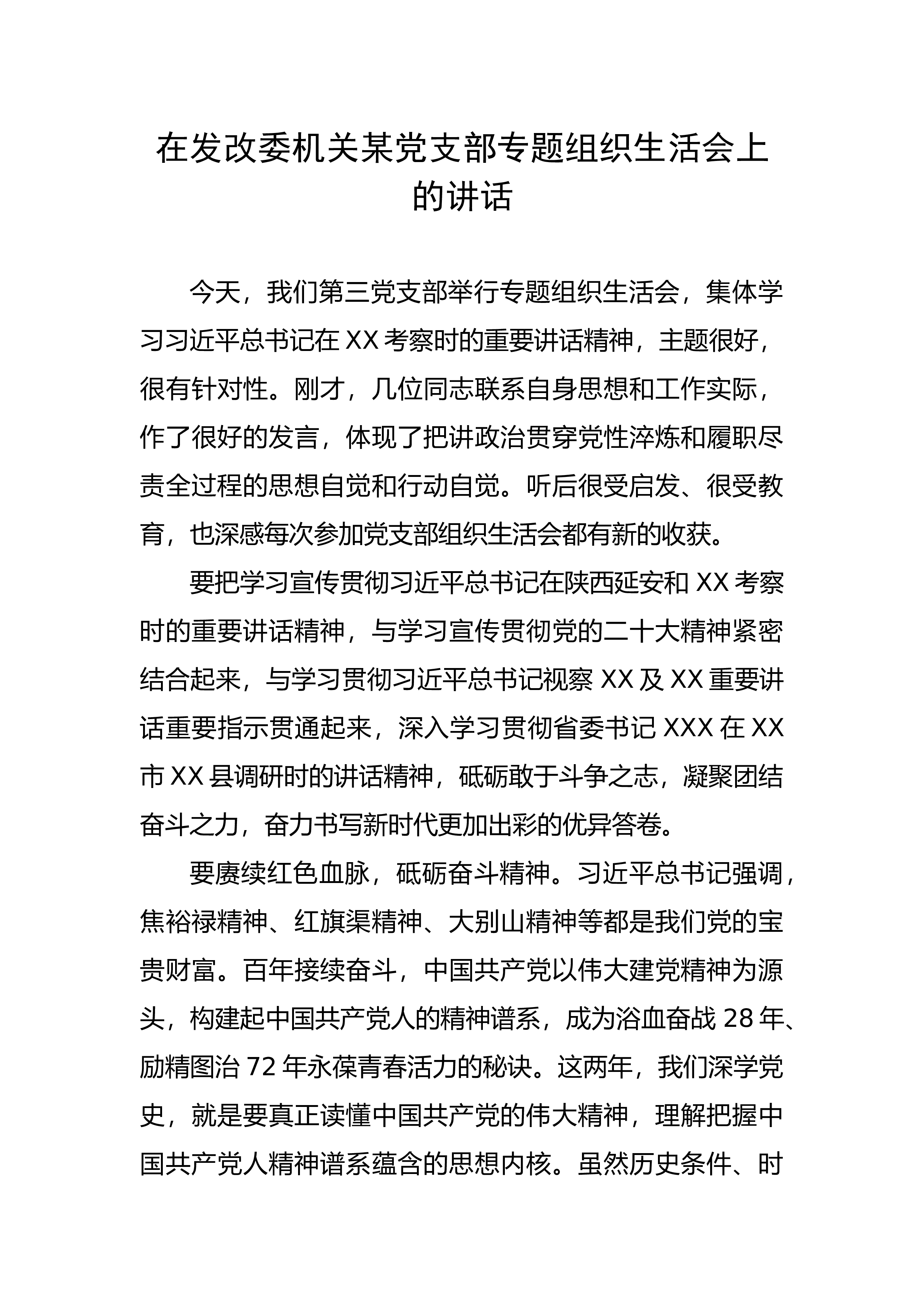 在发改委机关某党支部专题组织生活会上的讲话今天,我们第三党支部举行专题组织生活会,集体学习习近平总书记在XX考察时的重要讲话精神,主题很好,很有针对性。刚才,几位同志联系自身思想和工作实际,作了很好的发言,体现了把讲政治贯穿党性淬炼和履职尽责全过程的思想自觉和行动自觉。听后很受启发、很受教育,也深感每次参加党支部组织生活会都有新的收获。要把学习宣传贯彻习近平总书记在陕西延安和XX考察时的重要讲话精神,与学习宣传贯彻党的二十大精神紧密结合起来,与学习贯彻习近平总书记视察XX及XX重要讲话重要指示贯通起来,深入学习贯彻省委书记XXX在XX市XX县调研时的讲话精神,砥砺敢于斗争之志,凝聚团结奋斗之力...