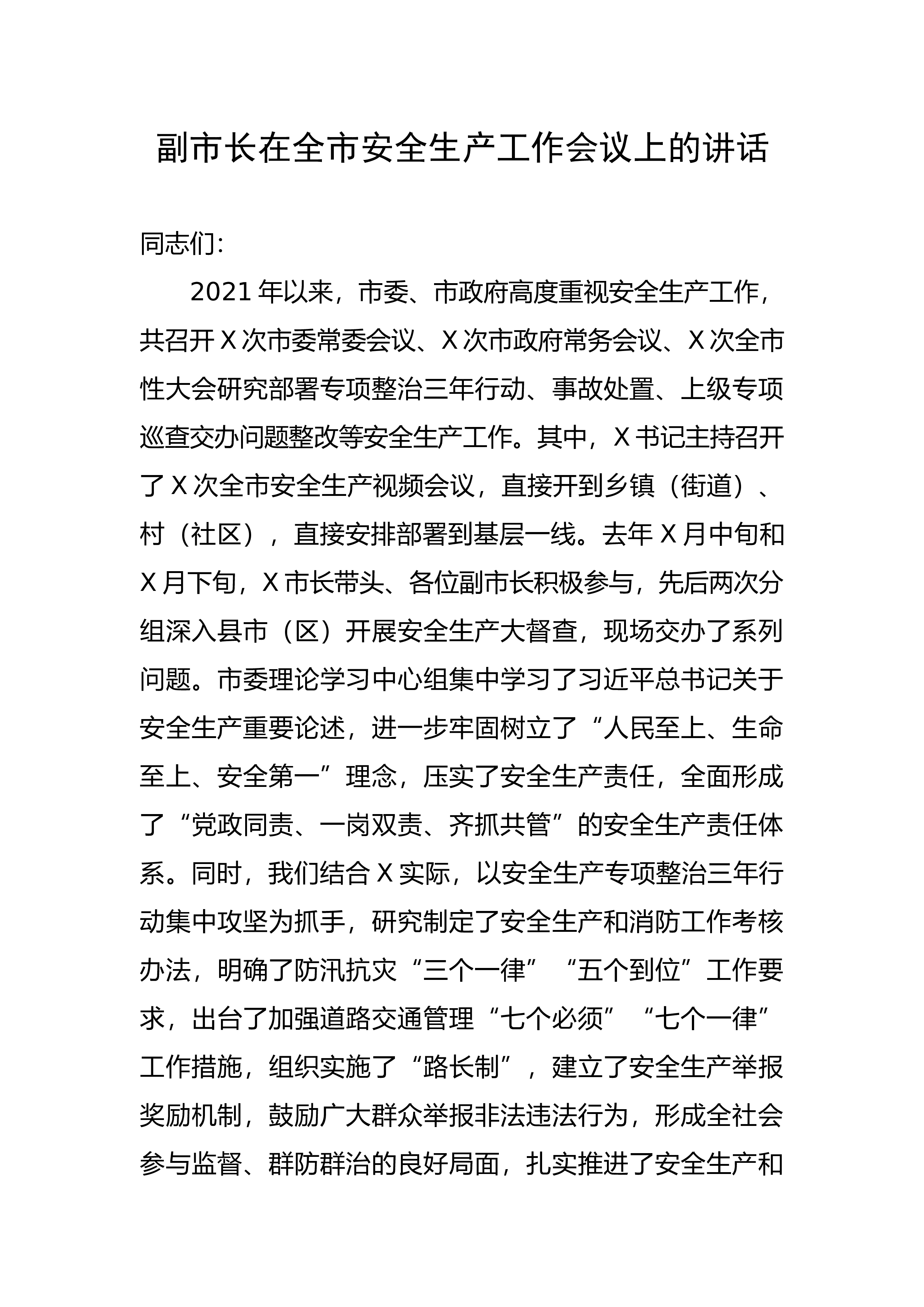 副市长在全市安全生产工作会议上的讲话同志们:2021年以来,市委、市政府高度重视安全生产工作,共召开X次市委常委会议、X次市政府常务会议、X次全市性大会研究部署专项整治三年行动、事故处置、上级专项巡查交办问题整改等安全生产工作。其中,X书记主持召开了X次全市安全生产视频会议,直接开到乡镇(街道)、村(社区),直接安排部署到基层一线。去年X月中旬和X月下旬,X市长带头、各位副市长积极参与,先后两次分组深入县市(区)开展安全生产大督查,现场交办了系列问题。市委理论学习中心组集中学习了习近平总书记关于安全生产重要论述,进一步牢固树立了“人民至上、生命至上、安全第一”理念,压实了安全生产责任,全面形成...