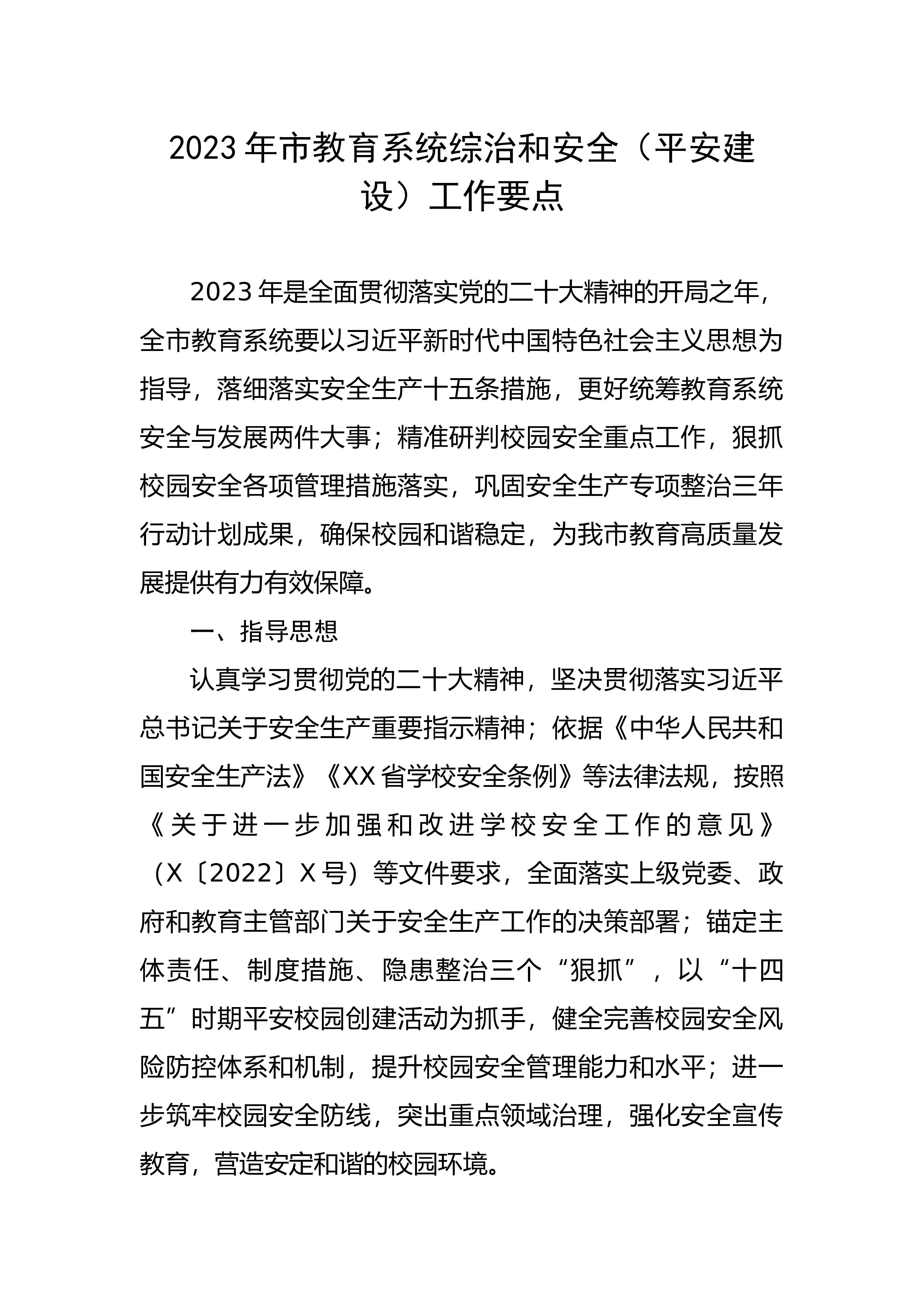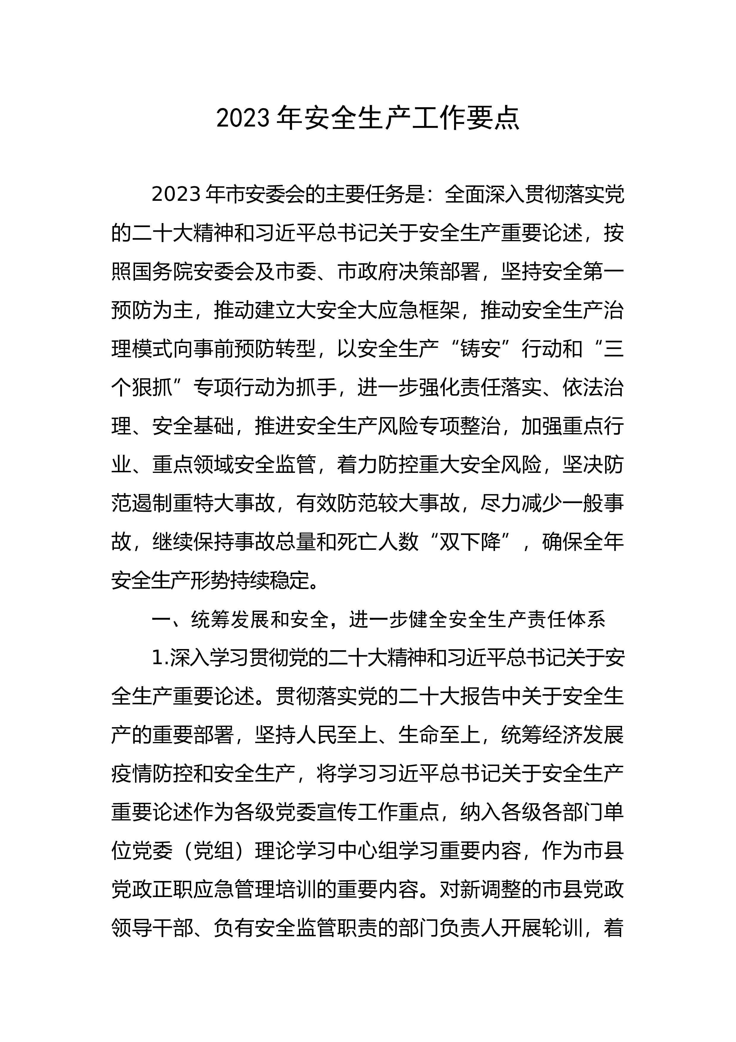 2023年安全生产工作要点2023年市安委会的主要任务是:全面深入贯彻落实党的二十大精神和习近平总书记关于安全生产重要论述,按照国务院安委会及市委、市政府决策部署,坚持安全第一预防为主,推动建立大安全大应急框架,推动安全生产治理模式向事前预防转型,以安全生产“铸安”行动和“三个狠抓”专项行动为抓手,进一步强化责任落实、依法治理、安全基础,推进安全生产风险专项整治,加强重点行业、重点领域安全监管,着力防控重大安全风险,坚决防范遏制重特大事故,有效防范较大事故,尽力减少一般事故,继续保持事故总量和死亡人数“双下降”,确保全年安全生产形势持续稳定。一、统筹发展和安全,进一步健全安全生产责任体系1.深...