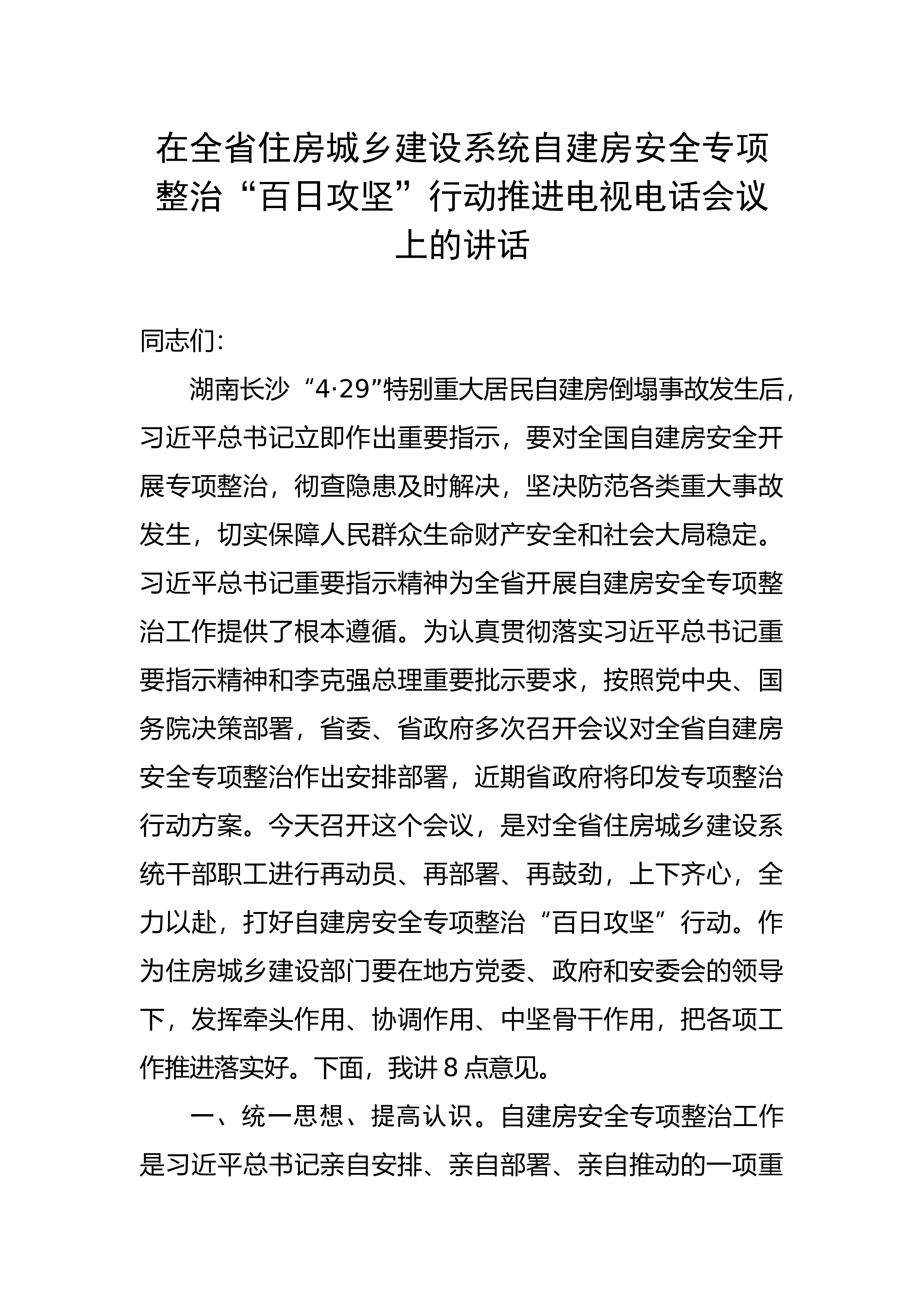 【安全生产】在全省住房城乡建设系统自建房安全专项整治“百日攻坚”行动推进电视电话会议上的讲话