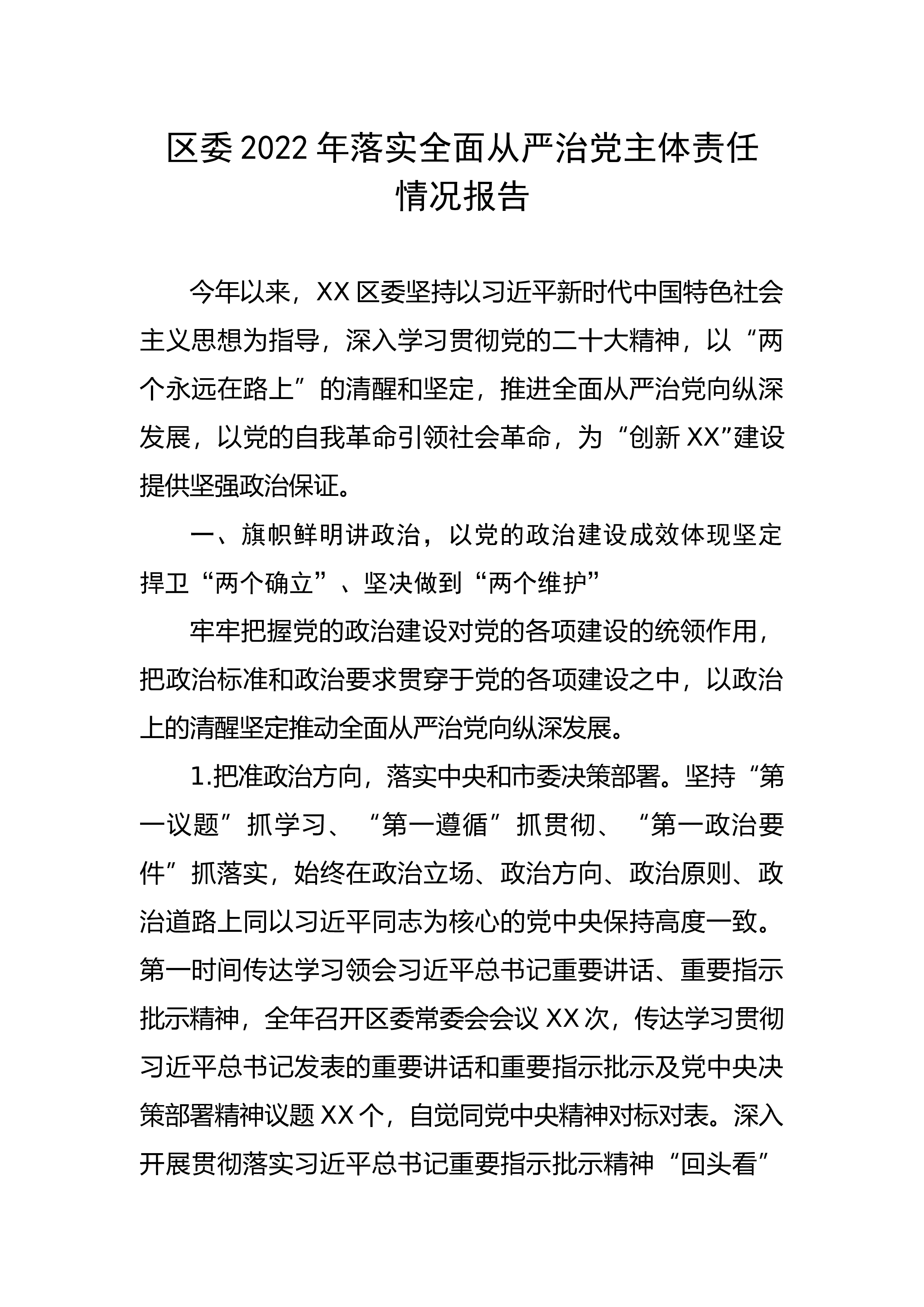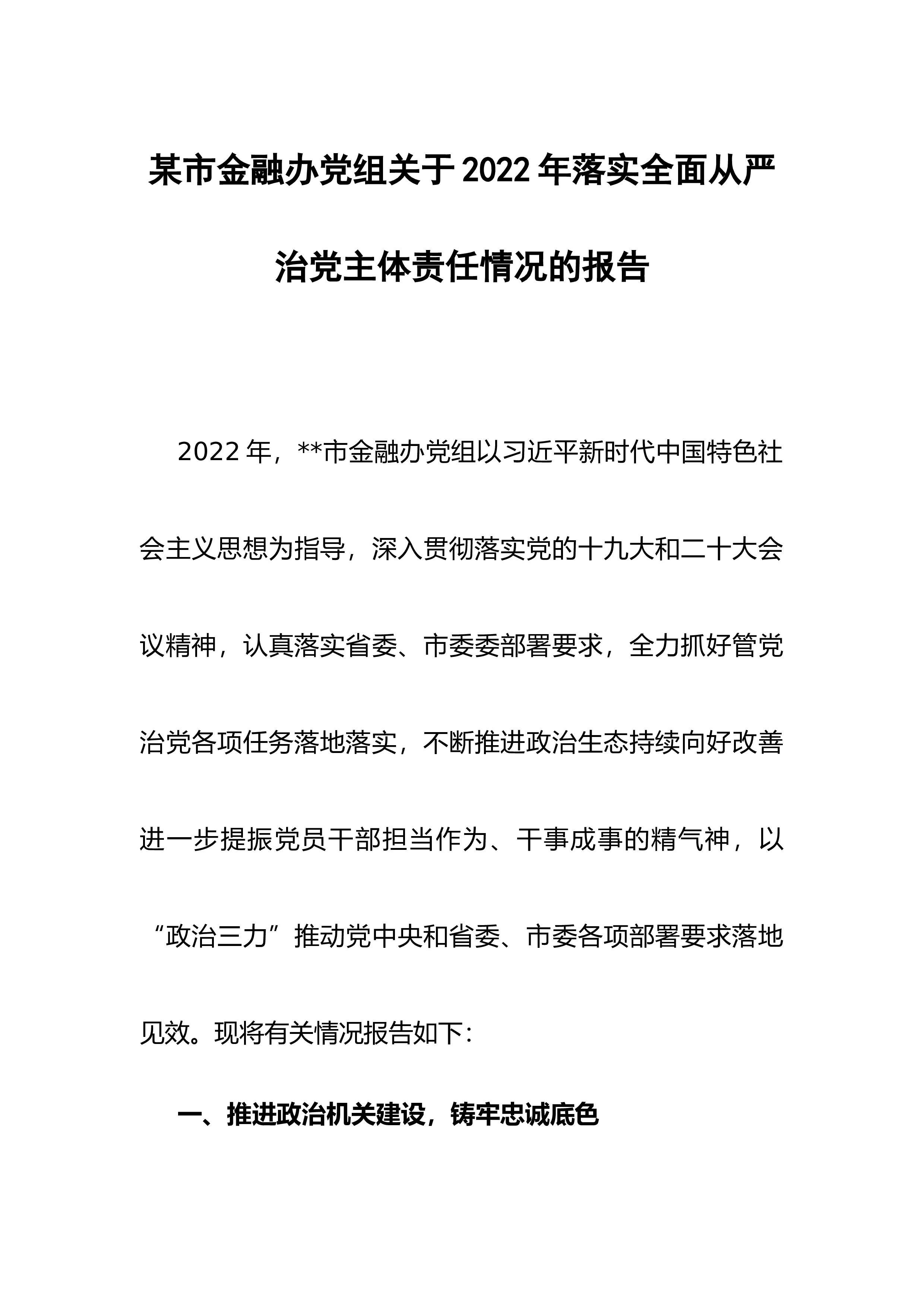 市财政局领导班子2022年落实全面从严治党主体责任工作情况报告2022年,市财政局党组坚持以习近平新时代中国特色社会主义思想为指导,坚定捍卫“两个确立”,坚决做到“两个维护”,认真履行全面从严治党主体责任,主要负责同志坚决扛起第一责任人责任,班子成员切实履行“一岗双责”,着力加强政治机关建设,坚持以政领财、以财辅政,强化“财”自觉服从服务于“政”的意识,不断提高政治判断力、政治领悟力、政治执行力。着力强化理论武装,夯实党建基础,加强队伍建设,持续转变作风,充分发挥财政职能作用,努力推动党中央决策部署和市委工作要求落地落实。现将有关情况报告如下:一、加强党的政治建设,坚守政治机关定位,坚决做到“...