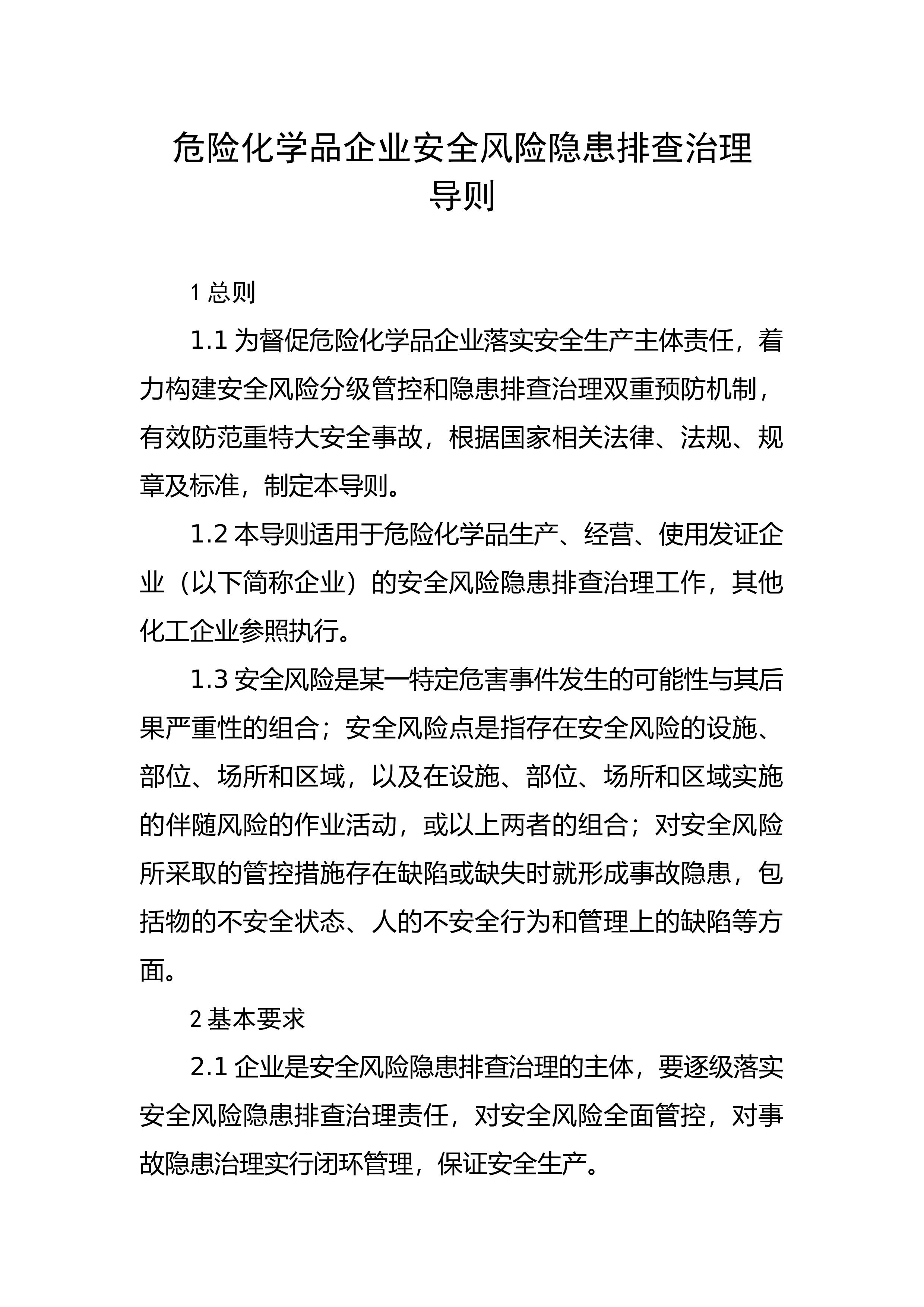 危险化学品企业安全风险隐患排查治理导则1总则1.1为督促危险化学品企业落实安全生产主体责任,着力构建安全风险分级管控和隐患排查治理双重预防机制,有效防范重特大安全事故,根据国家相关法律、法规、规章及标准,制定本导则。1.2本导则适用于危险化学品生产、经营、使用发证企业(以下简称企业)的安全风险隐患排查治理工作,其他化工企业参照执行。1.3安全风险是某一特定危害事件发生的可能性与其后果严重性的组合;安全风险点是指存在安全风险的设施、部位、场所和区域,以及在设施、部位、场所和区域实施的伴随风险的作业活动,或以上两者的组合;对安全风险所采取的管控措施存在缺陷或缺失时就形成事故隐患,包括物的不安全状态...