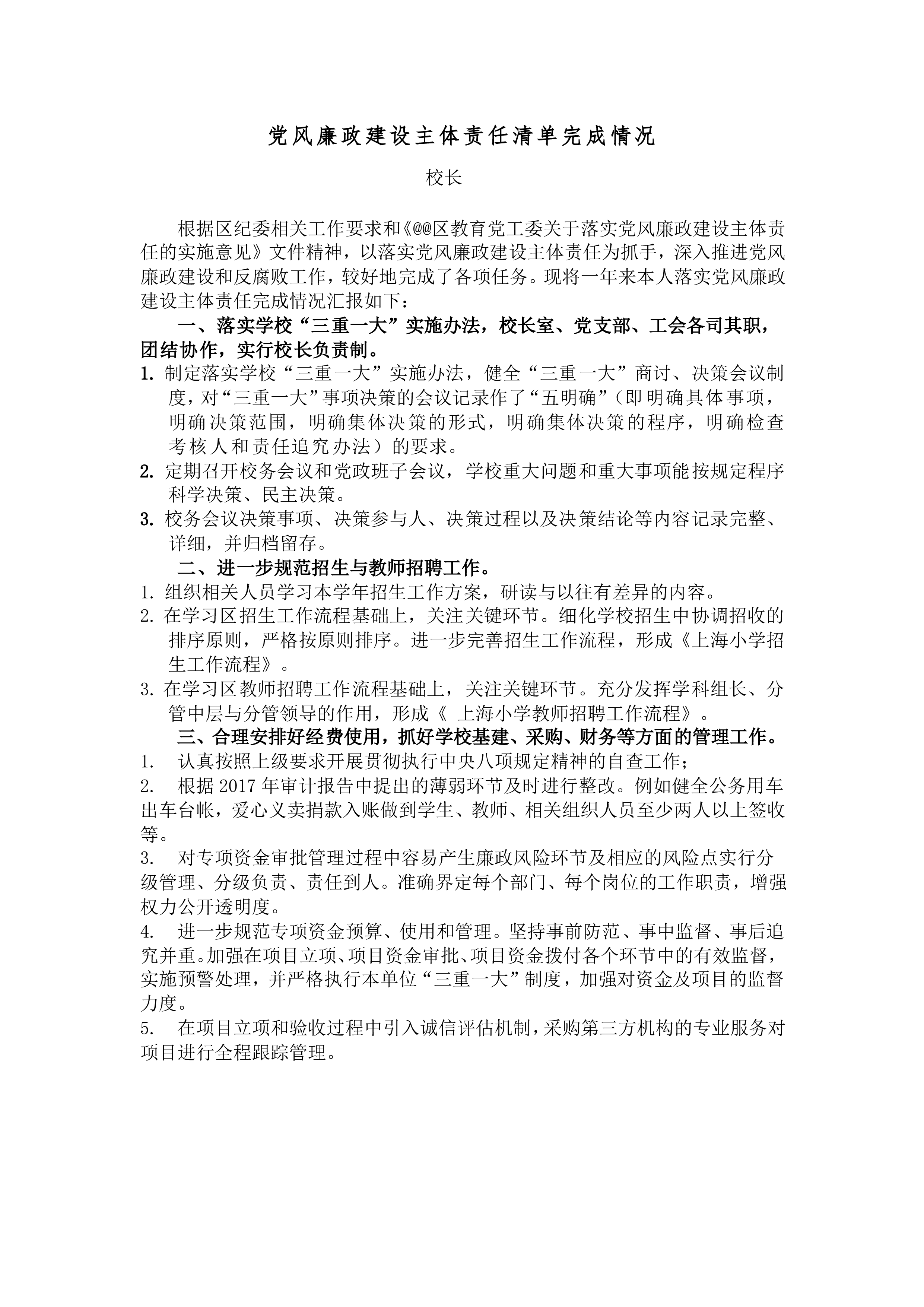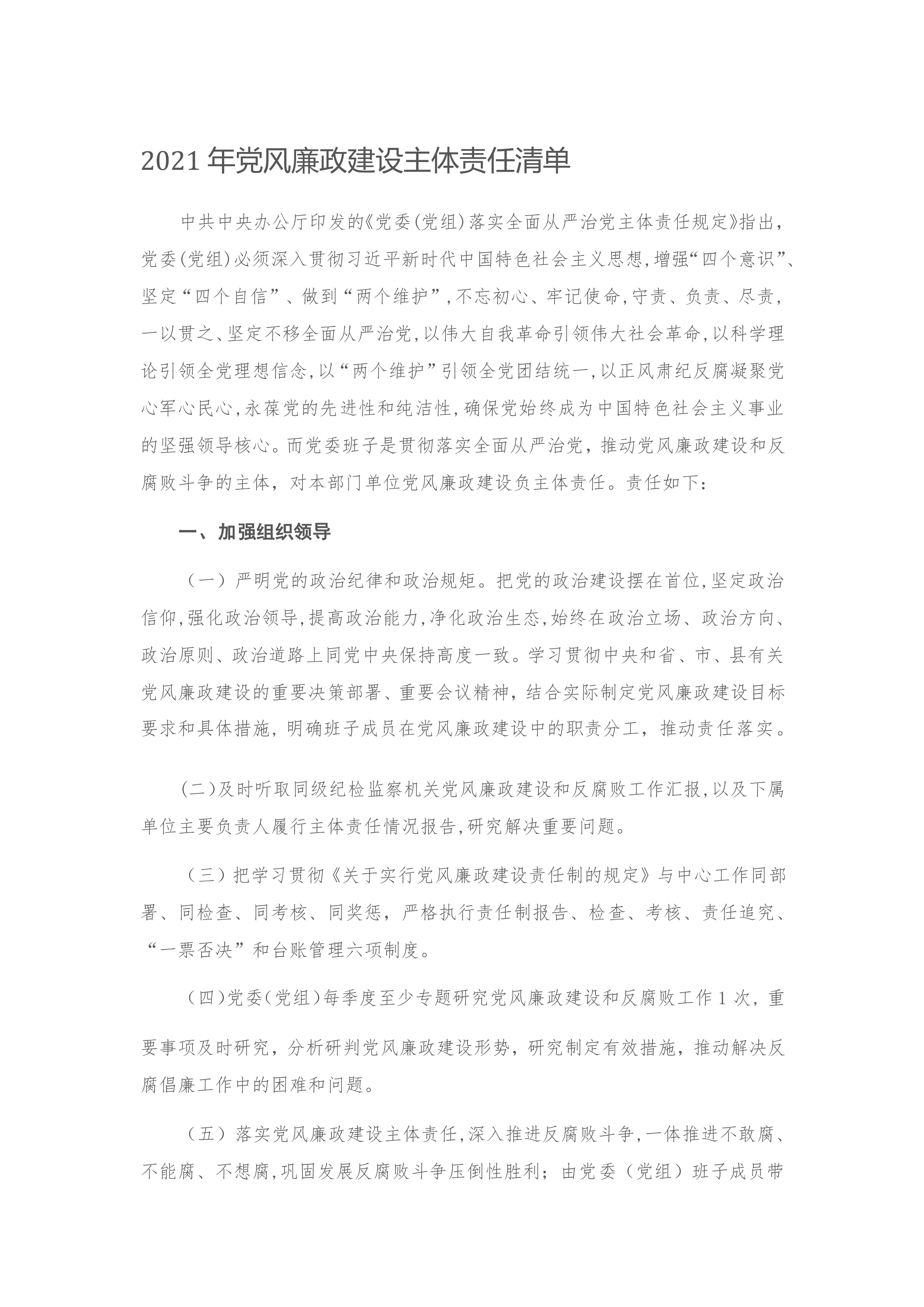 2021年党风廉政建设主体责任清单中共中央办公厅印发的《党委(党组)落实全面从严治党主体责任规定》指出,党委(党组)必须深入贯彻习近平新时代中国特色社会主义思想,增强“四个意识”、坚定“四个自信”、做到“两个维护”,不忘初心、牢记使命,守责、负责、尽责,一以贯之、坚定不移全面从严治党,以伟大自我革命引领伟大社会革命,以科学理论引领全党理想信念,以“两个维护”引领全党团结统一,以正风肃纪反腐凝聚党心军心民心,永葆党的先进性和纯洁性,确保党始终成为中国特色社会主义事业的坚强领导核心。而党委班子是贯彻落实全面从严治党,推动党风廉政建设和反腐败斗争的主体,对本部门单位党风廉政建设负主体责任。责任如下:...