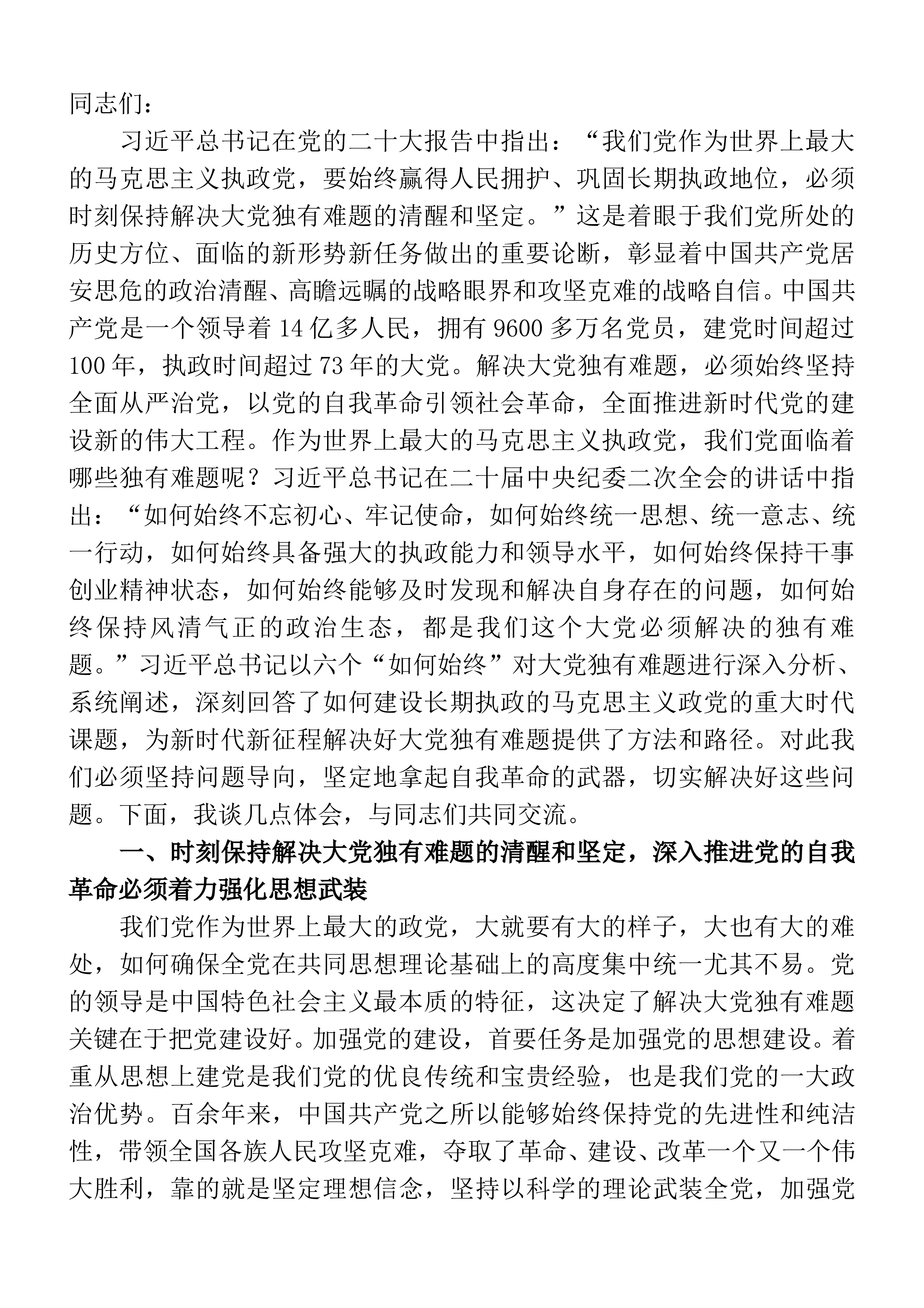 同志们,根据主T教育集中学习计划安排,今天由我围绕“深悟六个必须坚持奋力推动高质量发展”为题上一堂专题党课,也是和大家一起交流学习。习近平总书记指出,“继续推进实践基础上的理论创新首先要把握好新时代中国特色社会主义思想的世界观和方法论,坚持好、运用好贯穿其中的立场观点方法。”党的二十大报告首次将新时代马克思主义世界观和方法论归结为“六个必须坚持”,即必须坚持人民至上、坚持自信自立、坚持守正创新、坚持问题导向、坚持系统观念、坚持胸怀天下。这是马克思主义中国化时代化的重大理论创新,是习近平新时代中国特色社会主义思想世界观和方法论的理论精髓,更是对贯穿其中的立场观点方法的准确概括,为我们深刻理解习近...