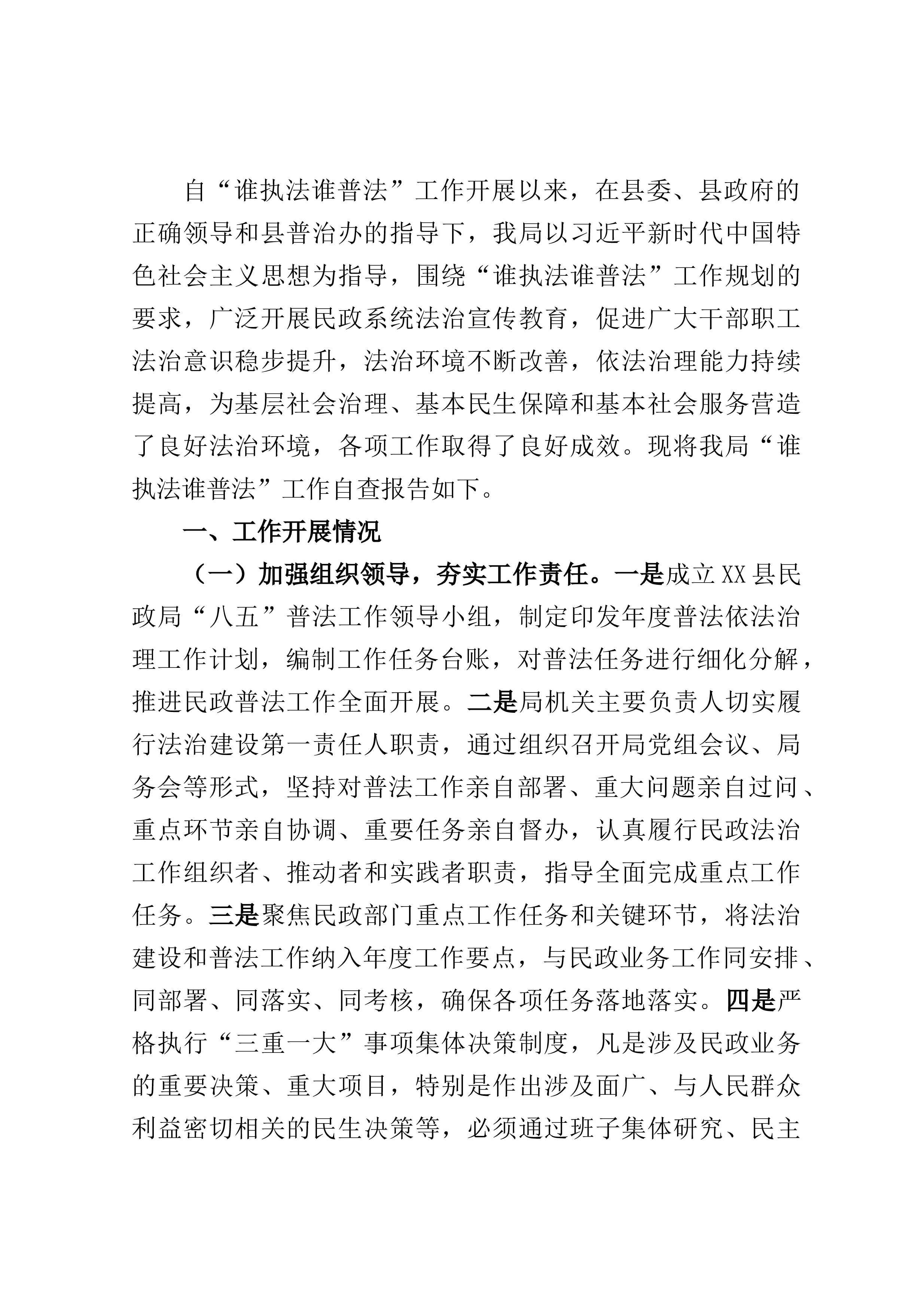 自“谁执法谁普法”工作开展以来,在县委、县政府的正确领导和县普治办的指导下,我局以习近平新时代中国特色社会主义思想为指导,围绕“谁执法谁普法”工作规划的要求,广泛开展民政系统法治宣传教育,促进广大干部职工法治意识稳步提升,法治环境不断改善,依法治理能力持续提高,为基层社会治理、基本民生保障和基本社会服务营造了良好法治环境,各项工作取得了良好成效。现将我局“谁执法谁普法”工作自查报告如下。一、工作开展情况(一)加强组织领导,夯实工作责任。一是成立XX县民政局“八五”普法工作领导小组,制定印发年度普法依法治理工作计划,编制工作任务台账,对普法任务进行细化分解,推进民政普法工作全面开展。二是局机关主...