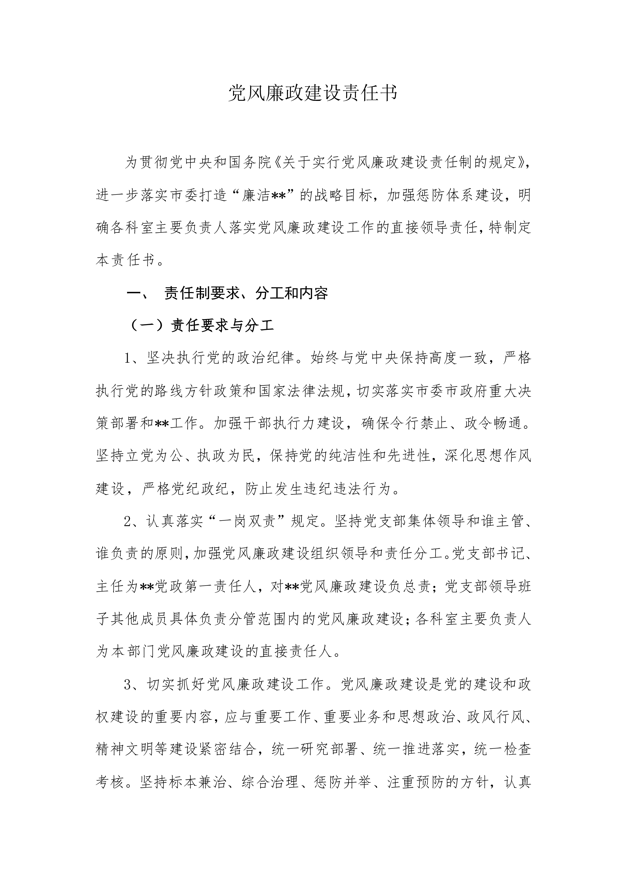 党风廉政建设责任书为贯彻党中央和国务院《关于实行党风廉政建设责任制的规定》,进一步落实市委打造“廉洁**”的战略目标,加强惩防体系建设,明确各科室主要负责人落实党风廉政建设工作的直接领导责任,特制定本责任书。一、责任制要求、分工和内容(一)责任要求与分工1、坚决执行党的政治纪律。始终与党中央保持高度一致,严格执行党的路线方针政策和国家法律法规,切实落实市委市政府重大决策部署和**工作。加强干部执行力建设,确保令行禁止、政令畅通。坚持立党为公、执政为民,保持党的纯洁性和先进性,深化思想