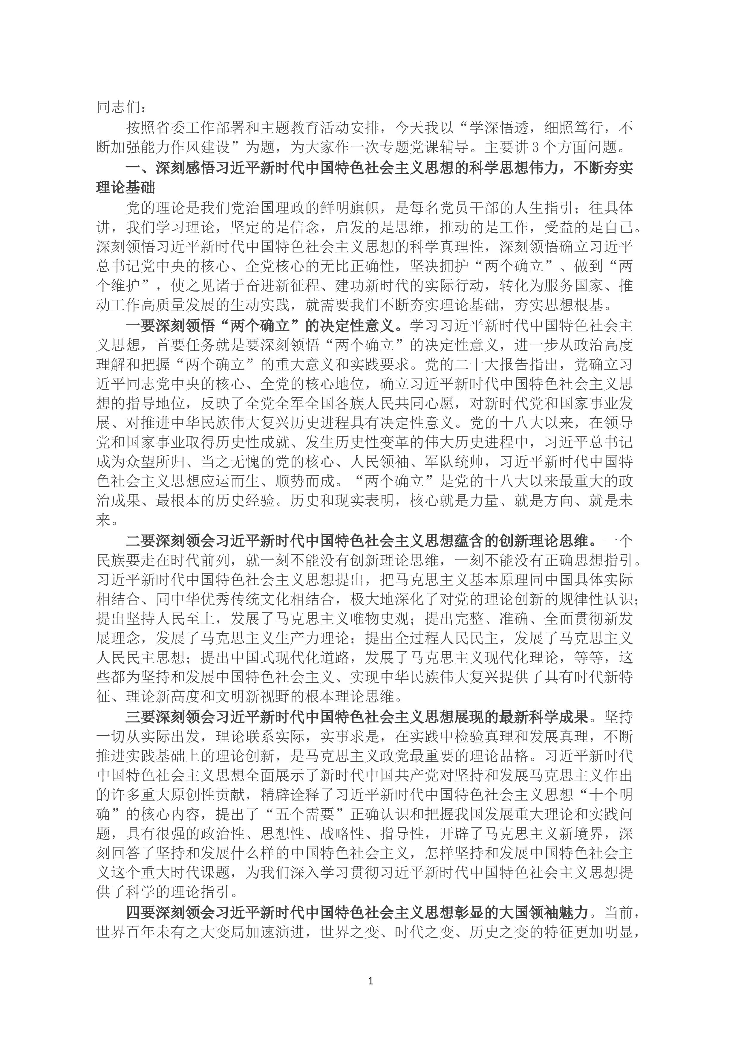 ”为题,为大家作一次专题党课辅导。主要讲3个方面问题。一、深刻感悟习近平新时代中国特色社会主义思想的科学思想伟力,不断夯实理论基础党的理论是我们党治国理政的鲜明旗帜,是每名党员干部的人生指引;往具体讲,我们学习理论,坚定的是信念,启发的是思维,推动的是工作,受益的是自己。深刻领悟习近平新时代中国特色社会主义思想的科学真理性,深刻领悟确立习近平总书记党中央的核心、全党核心的无比正确性,坚决拥护“两个确立”、做到“两个维护”,使之见诸于奋进新征程、建功新时代的实际行动,转化为服务国家、推动工作高质量发展的...