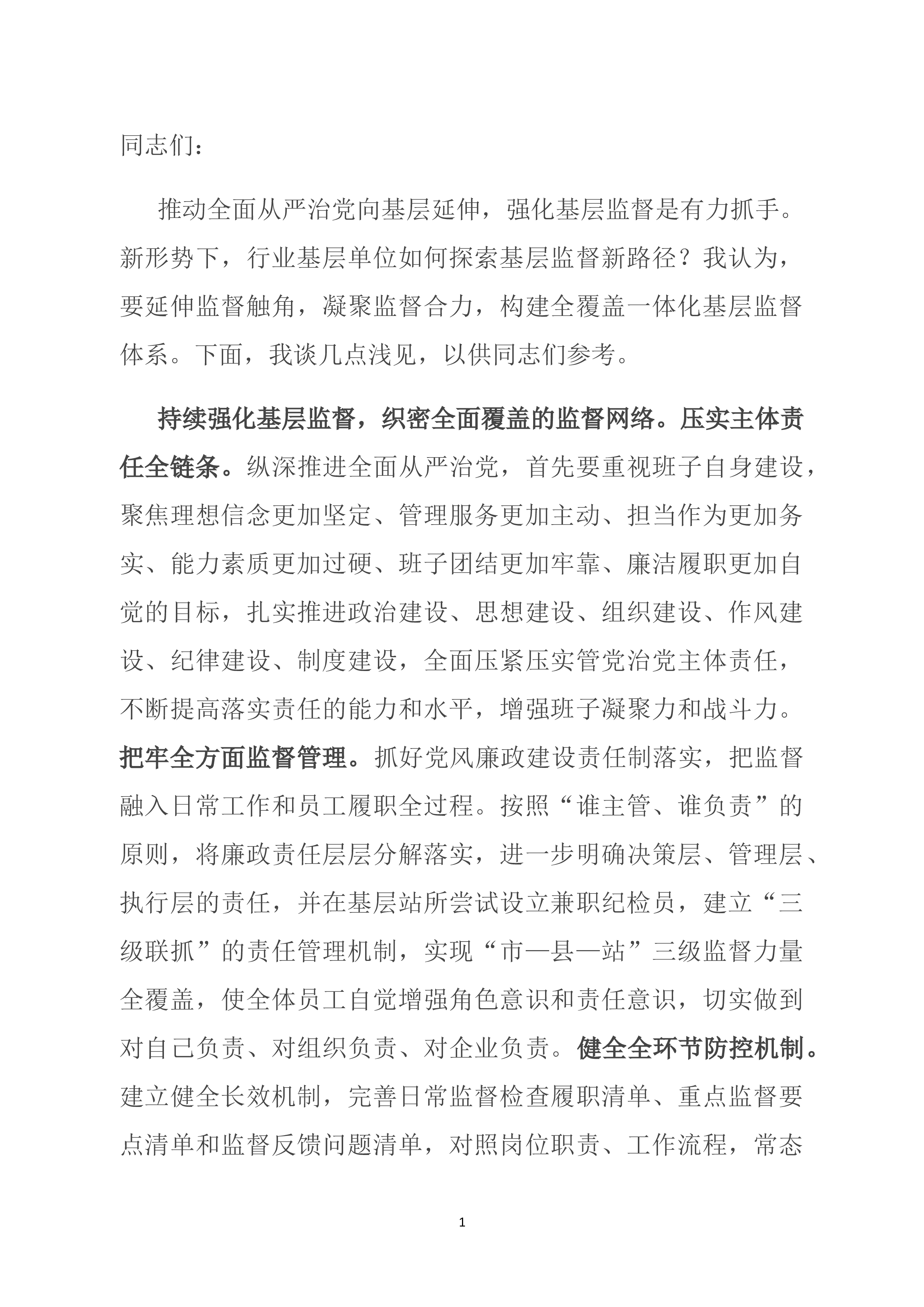 同志们:推动全面从严治党向基层延伸,强化基层监督是有力抓手。新形势下,行业基层单位如何探索基层监督新路径?我认为,要延伸监督触角,凝聚监督合力,构建全覆盖一体化基层监督体系。下面,我谈几点浅见,以供同志们参考。持续强化基层监督,织密全面覆盖的监督网络。压实主体责任全链条。纵深推进全面从严治党,首先要重视班子自身建设,聚焦理想信念更加坚定、管理服务更加主动、担当作为更加务实、能力素质更加过硬、班子团结更加牢靠、廉洁履职更加自觉的目标,扎实推进政治建设、思想建设、组织建设、