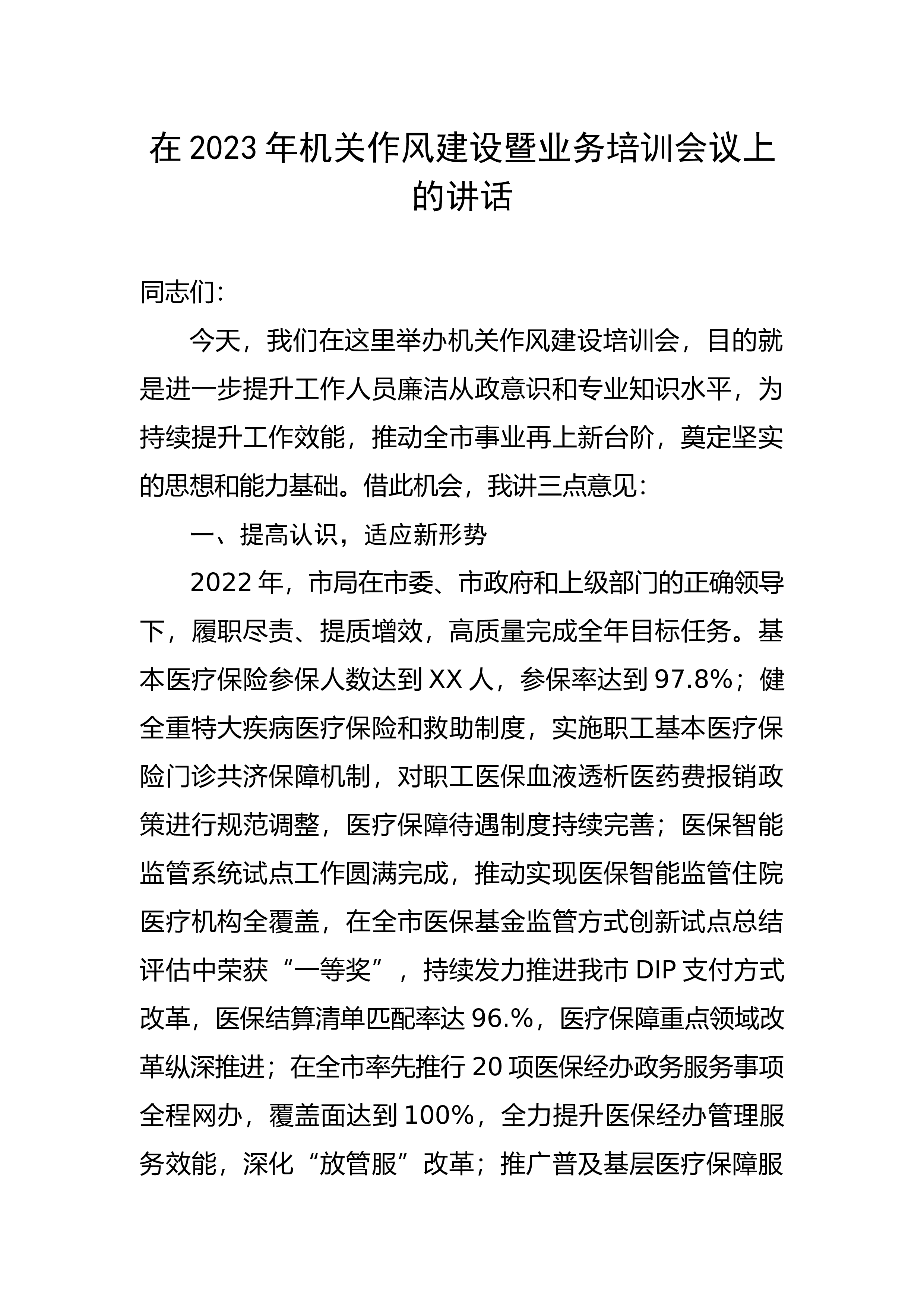 培训会,目的就是进一步提升工作人员廉洁从政意识和专业知识水平,为持续提升工作效能,推动全市事业再上新台阶,奠定坚实的思想和能力基础。借此机会,我讲三点意见:一、提高认识,适应新形势2022年,市局在市委、市政府和上级部门的正确领导下,履职尽责、提质增效,高质量完成全年目标任务。基本医疗保险参保人数达到XX人,参保率达到97.8%;健全重特大疾病医疗保险和救助制度,实施职工基本医疗保险门诊共济保障机制,对职工医保血液透析医药费报销政策进行规范调整,医疗保障待遇制度持续完善;医保智能监管系统试点工作圆满完成,推动...