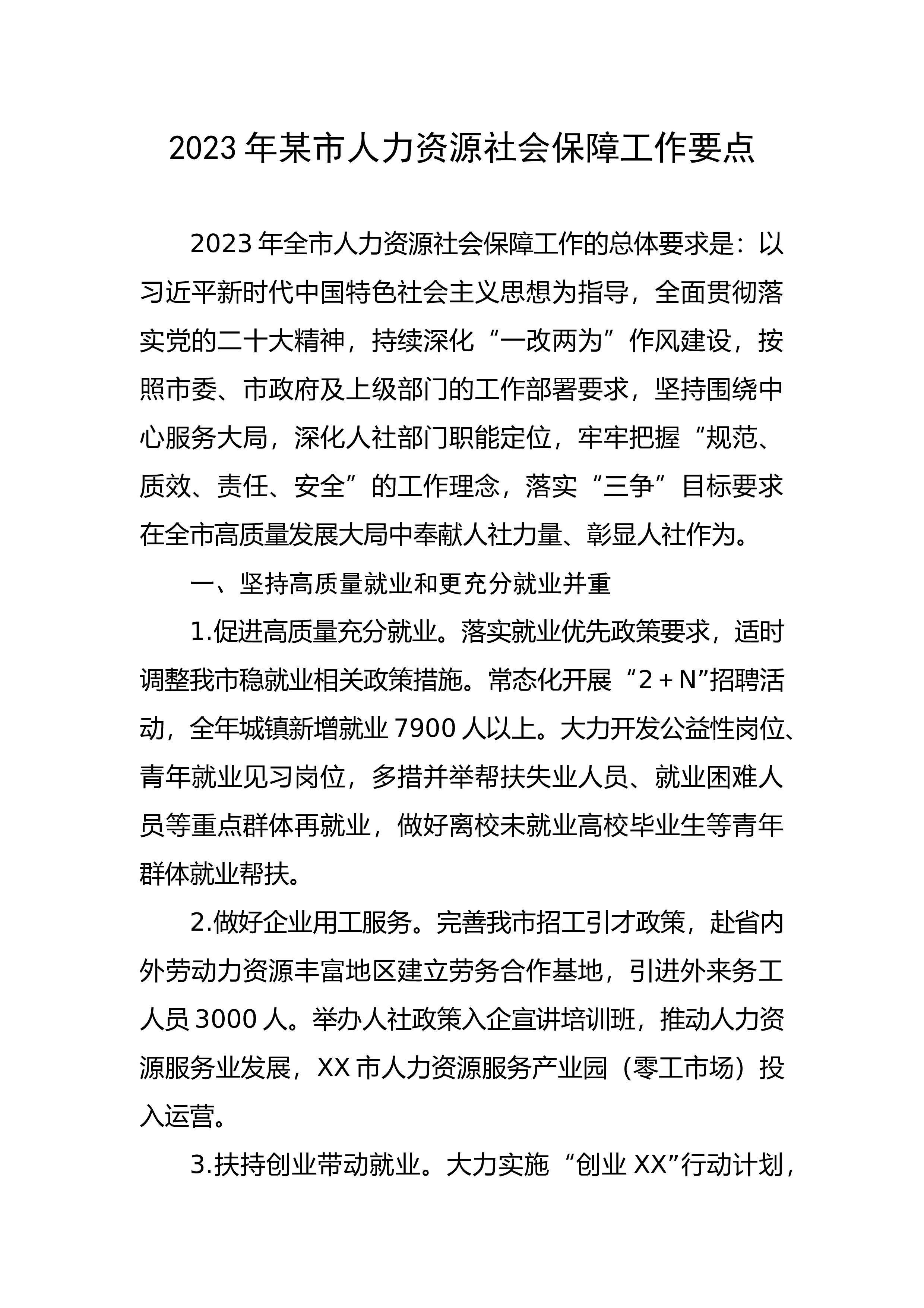 2023年某市人力资源社会保障工作要点2023年全市人力资源社会保障工作的总体要求是:以习近平新时代中国特色社会主义思想为指导,全面贯彻落实党的二十大精神,持续深化“一改两为”