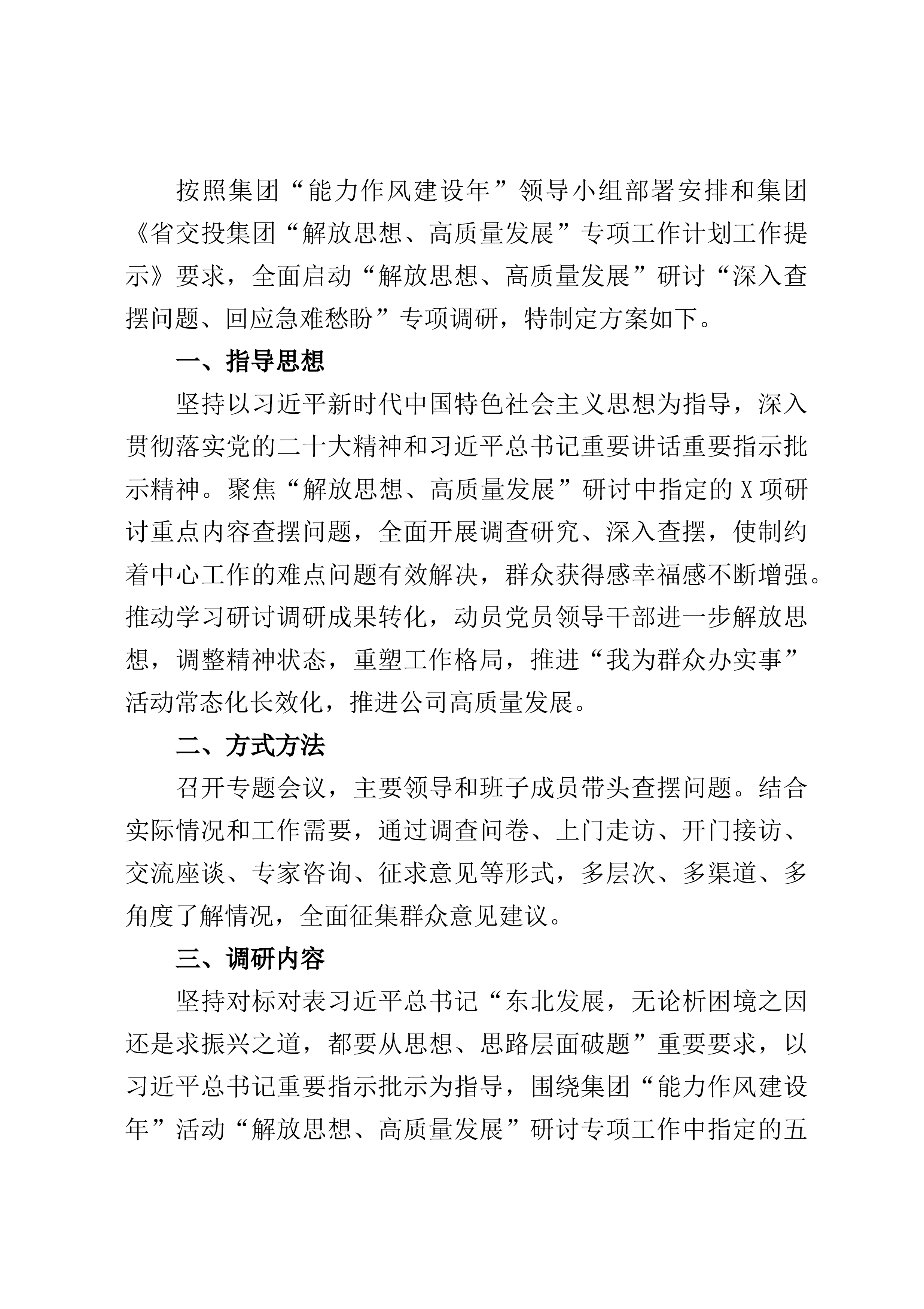 年”领导小组部署安排和集团《省交投集团“解放思想、高质量发展”专项工作计划工作提示》要求,全面启动“解放思想、高质量发展”研讨“深入查摆问题、回应急难愁盼”专项调研,特制定方案如下。一、指导思想坚持以习近平新时代中国特色社会主义思想为指导,深入贯彻落实党的二十大精神和习近平总书记重要讲话重要指示批示精神。聚焦“解放思想、高质量发展”研讨中指定的X项研讨重点内容查摆问题,全面开展调查研究、深入查摆,使制约着中心工作的难点问题有效解决,群众获得感幸福感不断增强。推动学习研讨调研成果转化,动员党员领导干部进一步解放思想,调整精神状态,重塑工作格局,推进“我为群众办实事”活动常态...