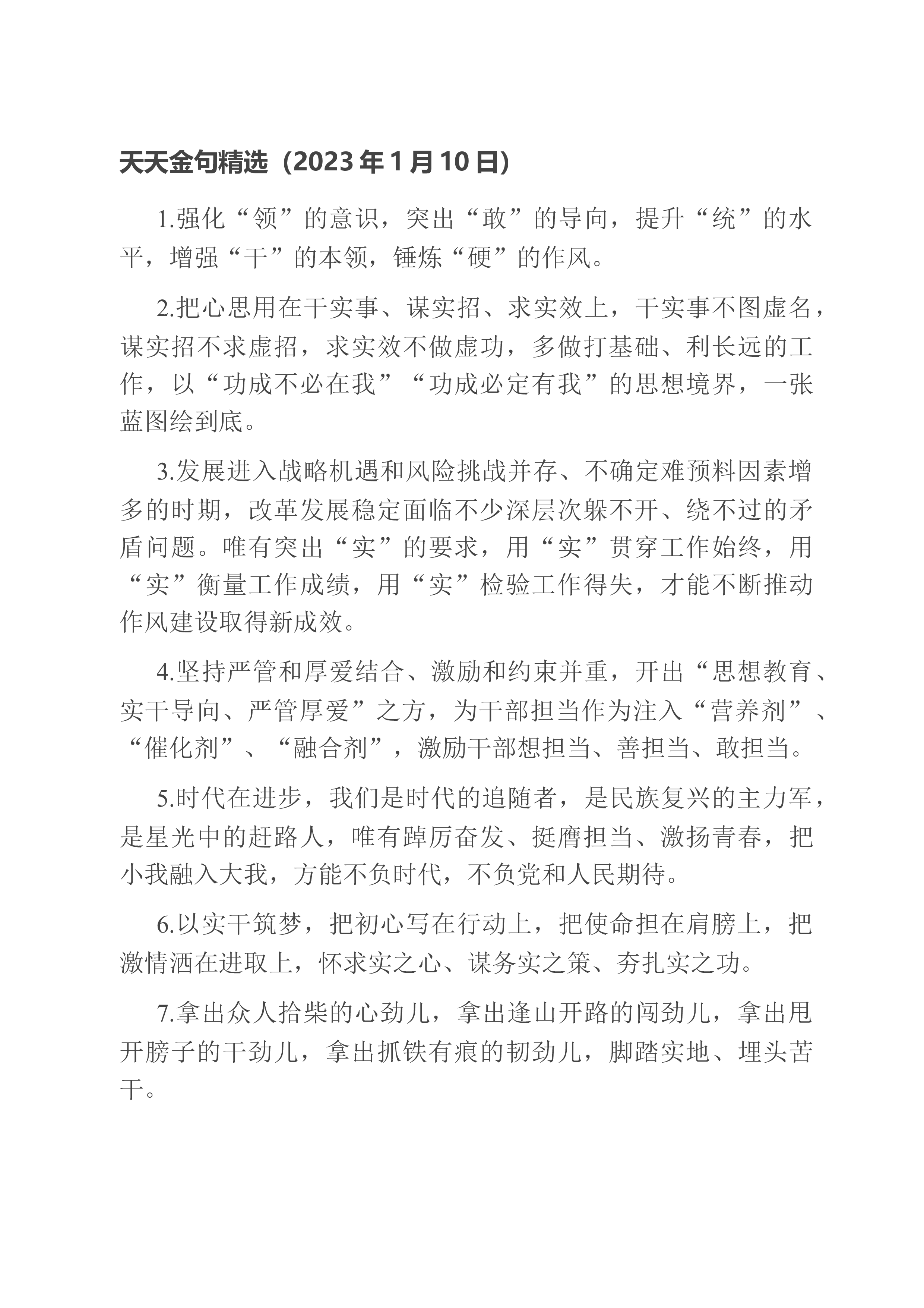 天天金句精选(2023年1月10日)1.强化“领”的意识,突出“敢”的导向,提升“统”的水平,增强“干”的本领,锤炼“硬”的作风。2.把心思用在干实事、谋实招、求实效上,干实事不图虚名,谋实招不求虚招,求实效不做虚功,多做打基础、利长远的工作,以“功成不必在我”“功成必定有我”的思想境界,一张蓝图绘到底。3.发展进入战略机遇和风险挑战并存、不确定难预料因素增多的时期,改革发展稳定面临不少深层次躲不开、绕不过的矛盾问题。唯有突出“实”的要求,用“实”贯穿工作始终,用“实”衡量工作成绩,用“实”检验工作得失,才能不断推动