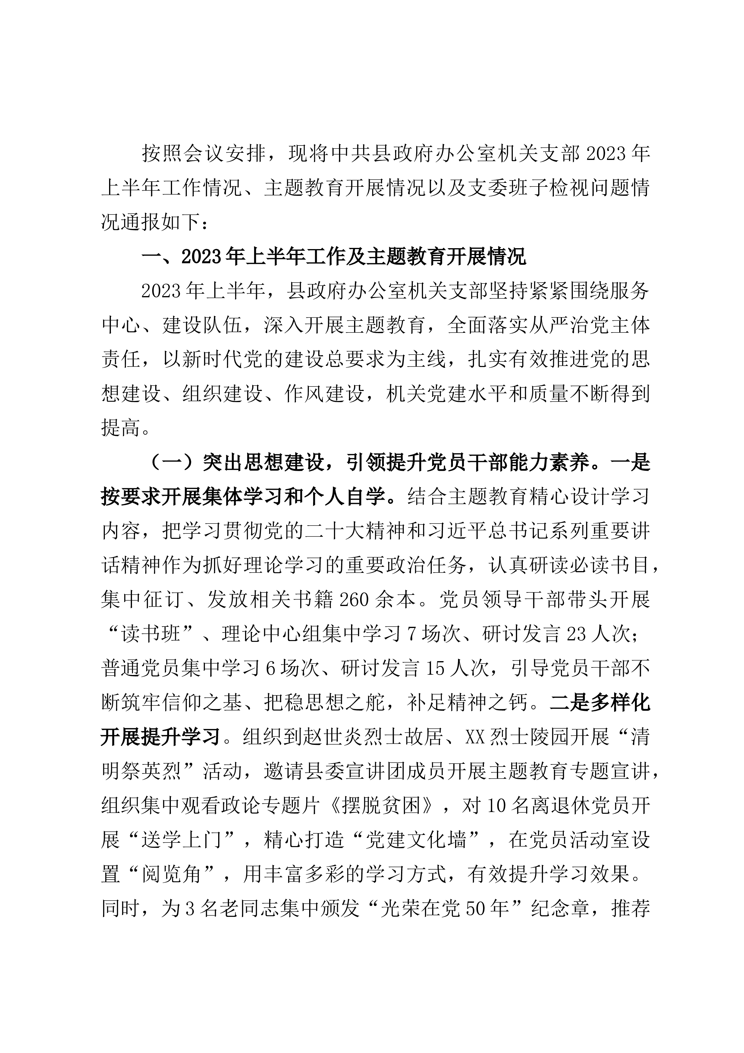按照会议安排,现将中共县政府办公室机关支部2023年上半年工作情况、主T教育开展情况以及支委班子检视问题情况通报如下:一、2023年上半年工作及主T教育开展情况2023年上半年,县政府办公室机关支部坚持紧紧围绕服务中心、建设队伍,深入开展主T教育,全面落实从严治党主体责任,以新时代党的建设总要求为主线,扎实有效推进党的思想建设、组织建设、