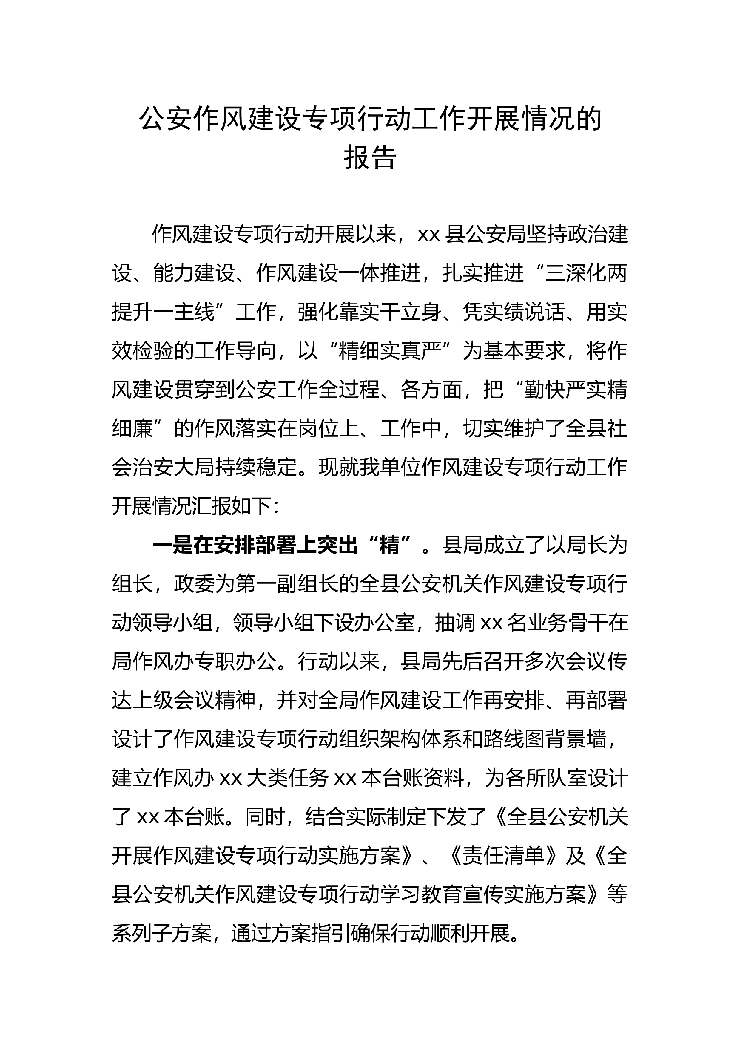 专项行动工作开展情况汇报如下:一是在安排部署上突出“精”。县局成立了以局长为组长,政委为第一副组长的全县公安机关